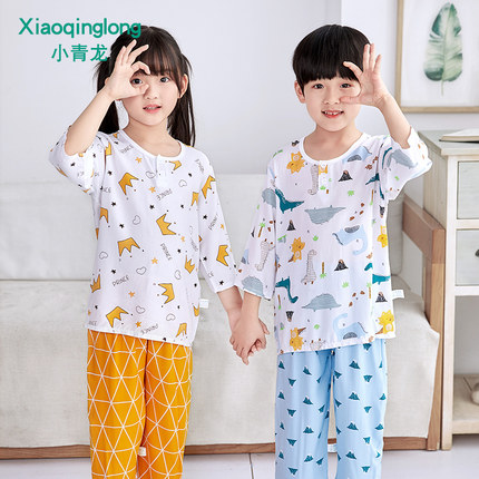 小青龙夏季儿童睡衣男童女童宝宝绵绸小孩八分薄款空调套装
