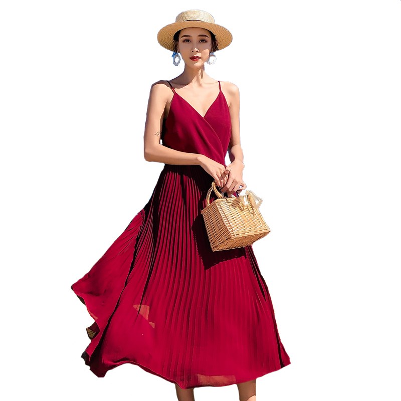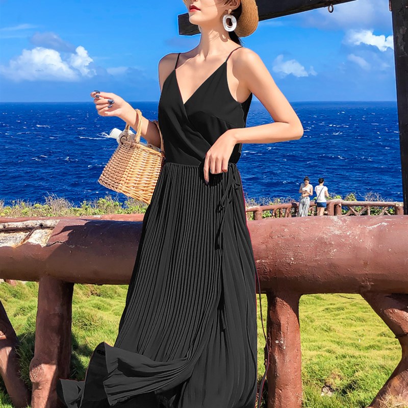 长裙女夏连衣裙新款气质百褶显瘦吊带裙外穿海边度假中长款沙滩裙