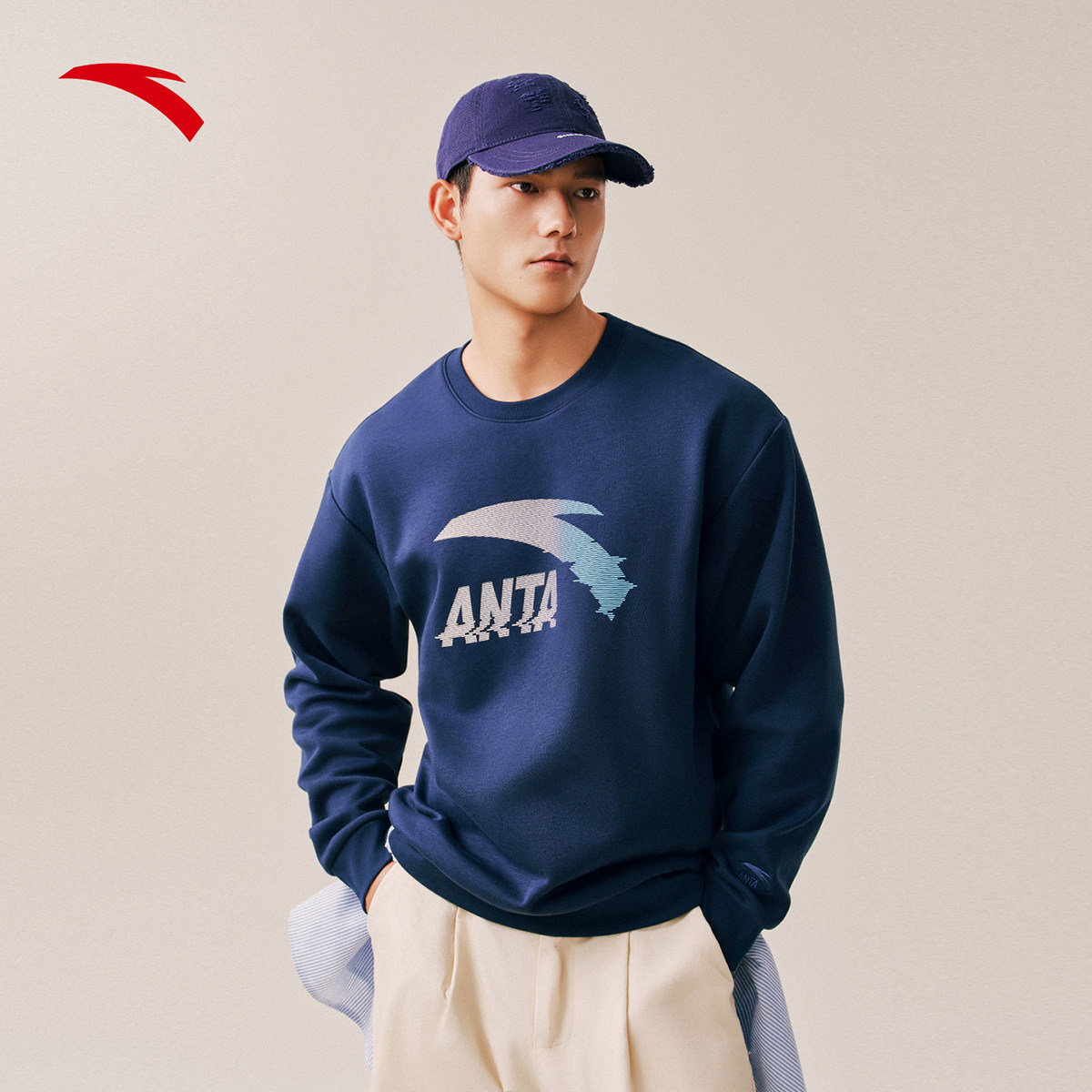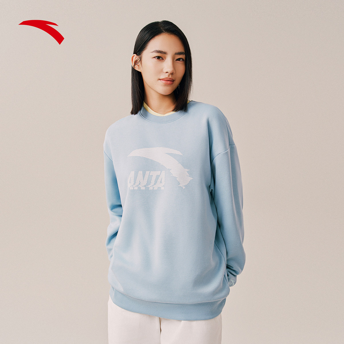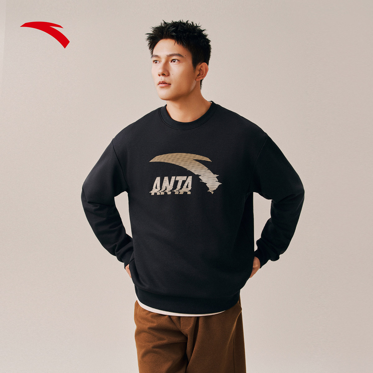 安踏休闲针织加绒卫衣男女同款冬冬新款黑色圆领套头长袖运动上衣