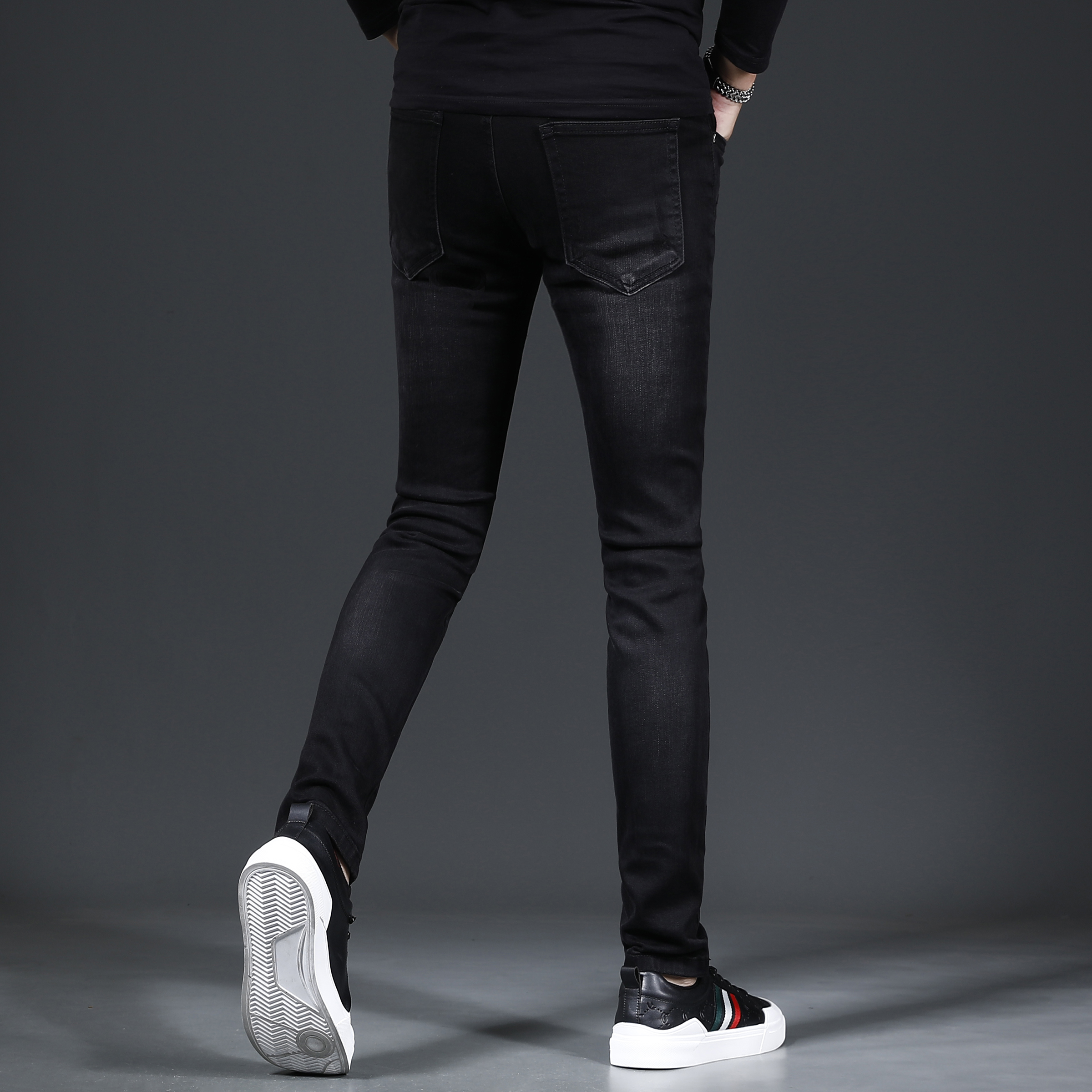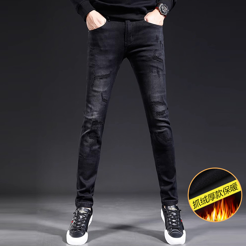 秋冬季黑色破洞牛仔裤男2025新款修身小脚裤补丁痞帅弹力男士裤子