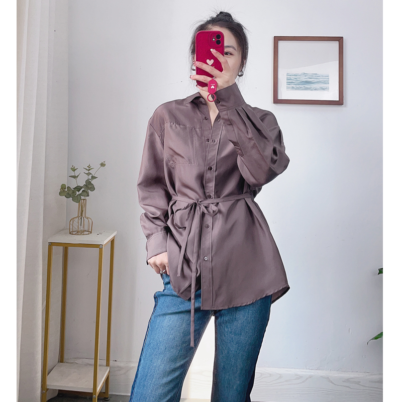 简约大气电力纺100桑蚕丝真丝纯色衬衫女 2025春夏中长款系带衬衣