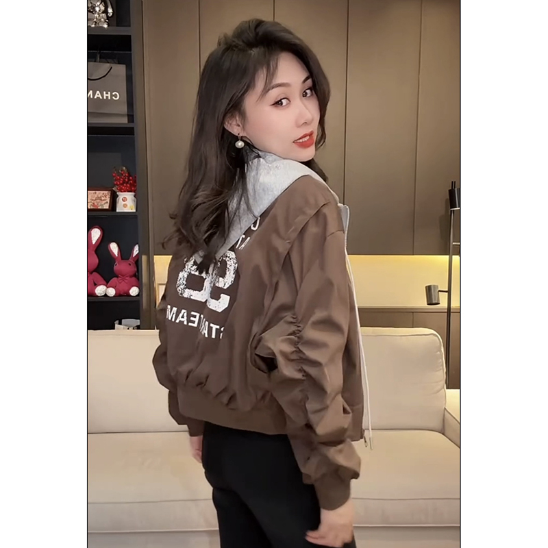 2025秋冬流行假两件外套女短款洋气夹棉帅气字母棒球服连帽小夹克