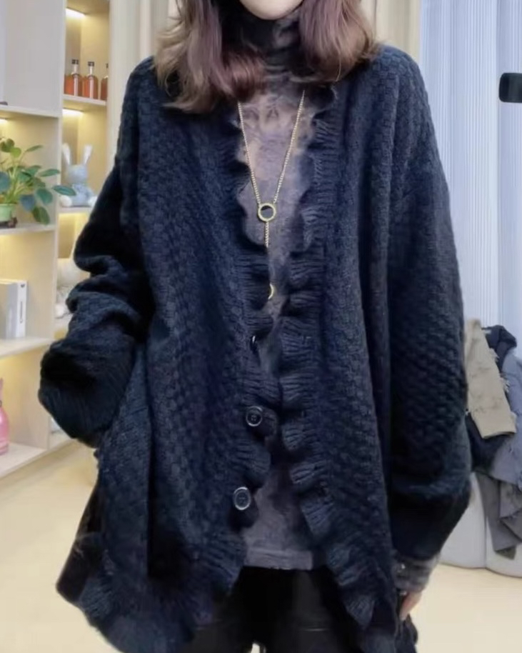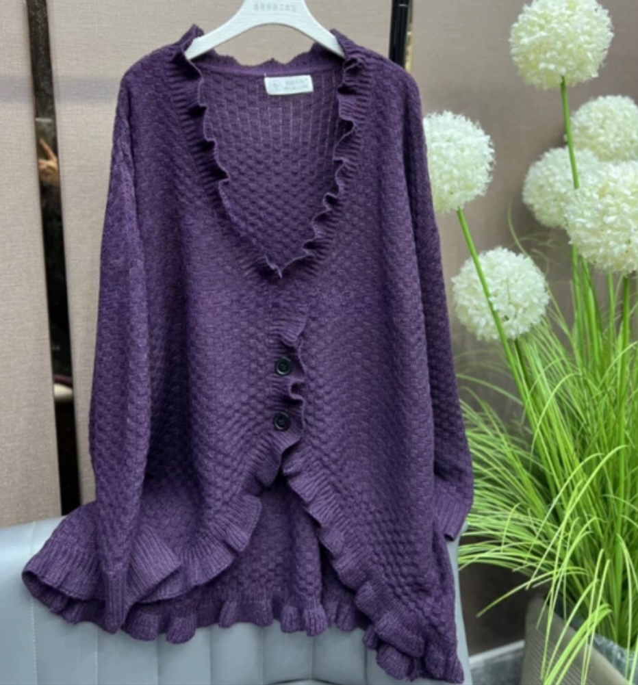 时尚慵懒气质2024百搭木耳边外搭针织开衫春秋新款宽松毛衣外套女