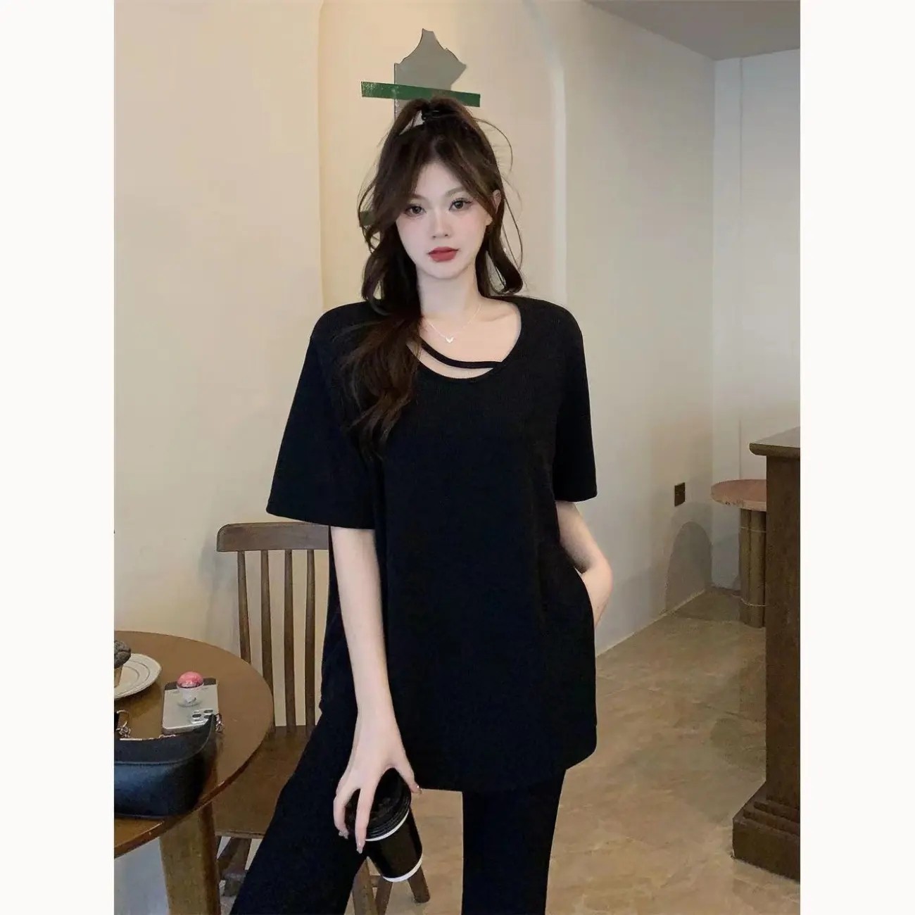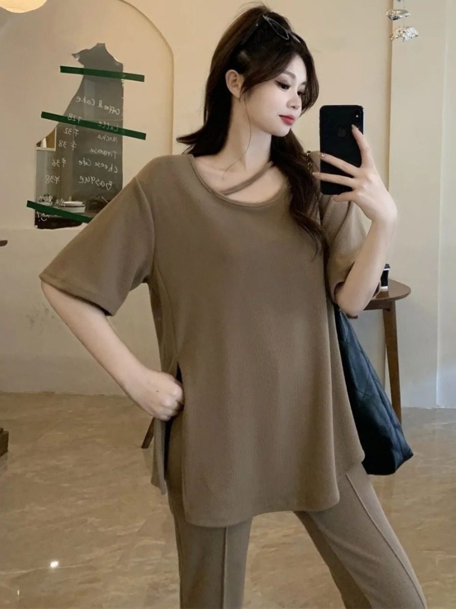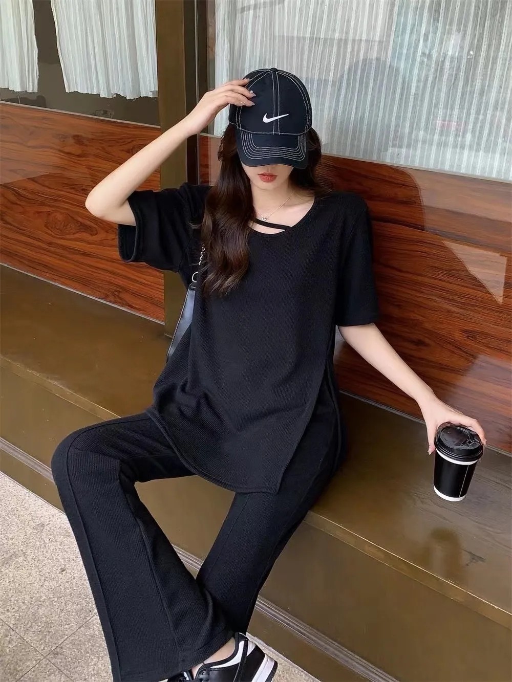 大码胖mm春夏宽松慵懒风纯色套装短袖T恤高腰显瘦喇叭裤两件套女