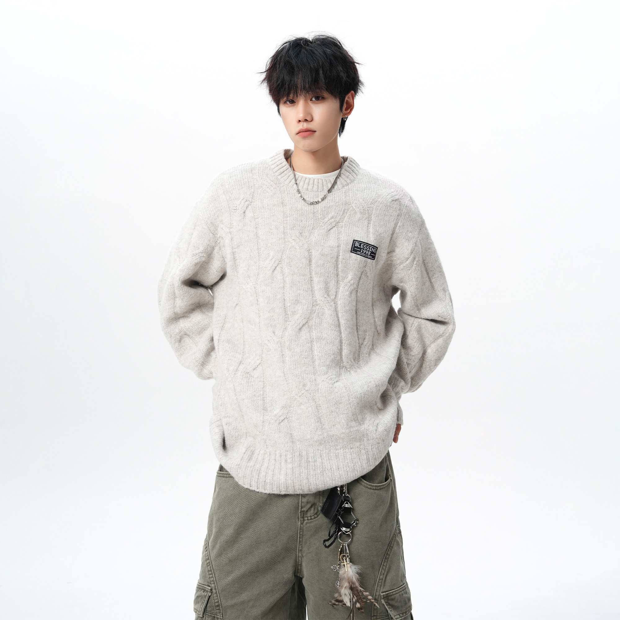 慵懒风麻花纹羊毛混纺圆领毛衣男