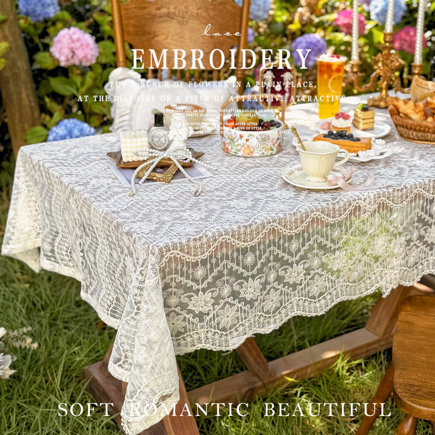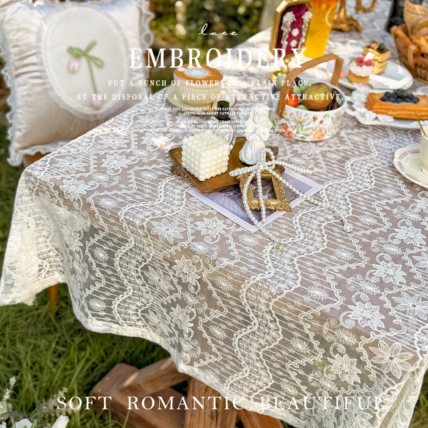 法式浪漫奶油米色蕾丝刺绣长方形桌布茶几餐桌布花园甜品台布盖巾