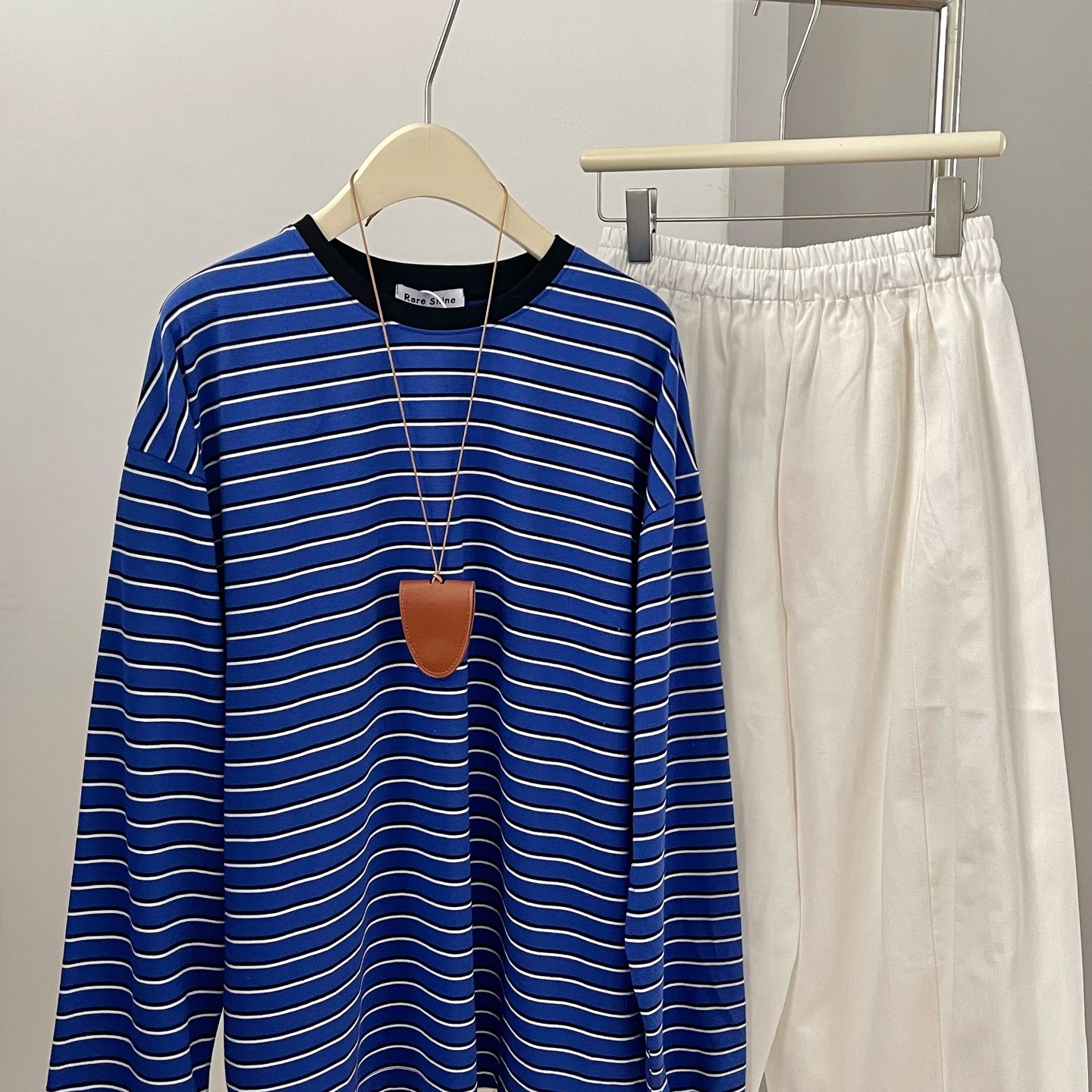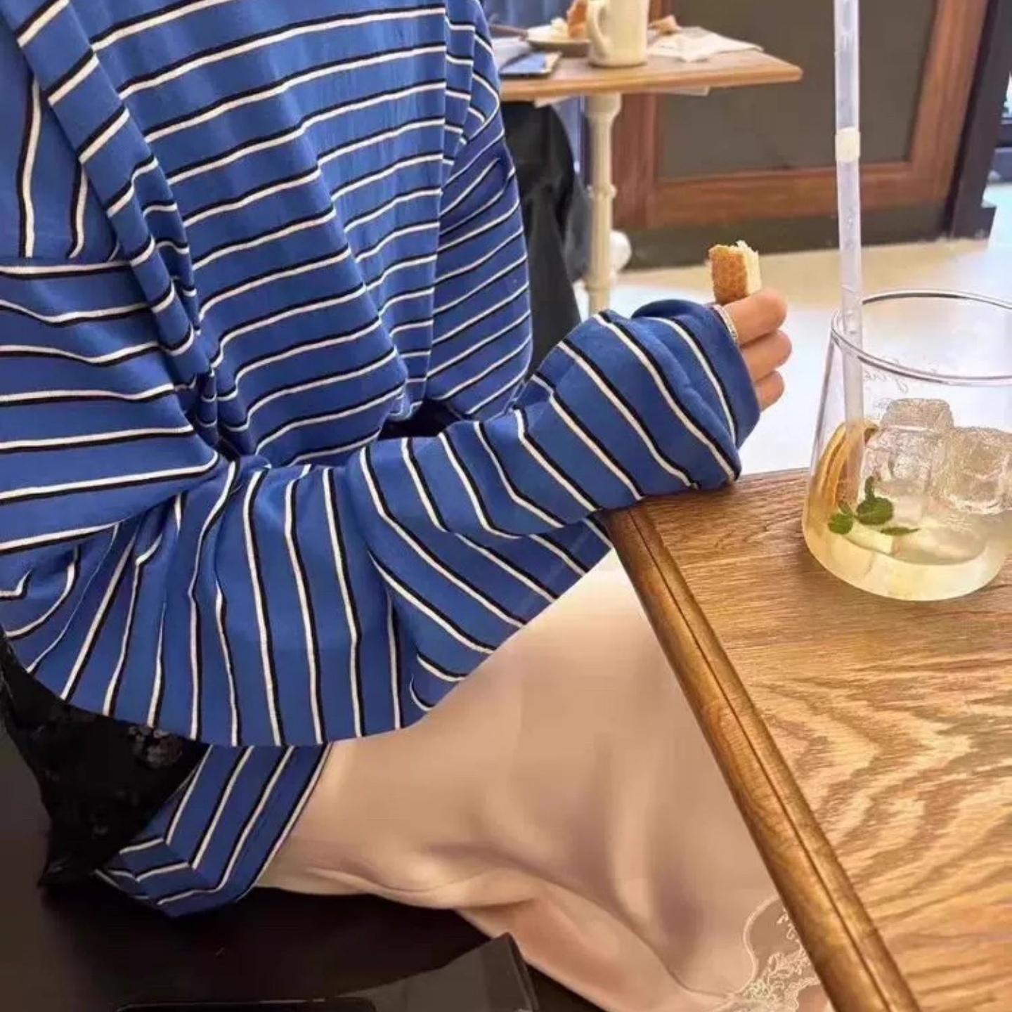 韩代 巨显白的蓝条纹!!宽松大版慵懒休闲纯棉条纹长袖T恤