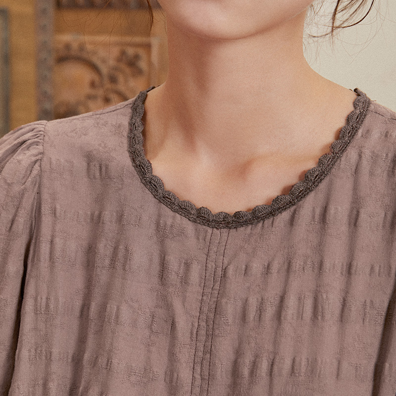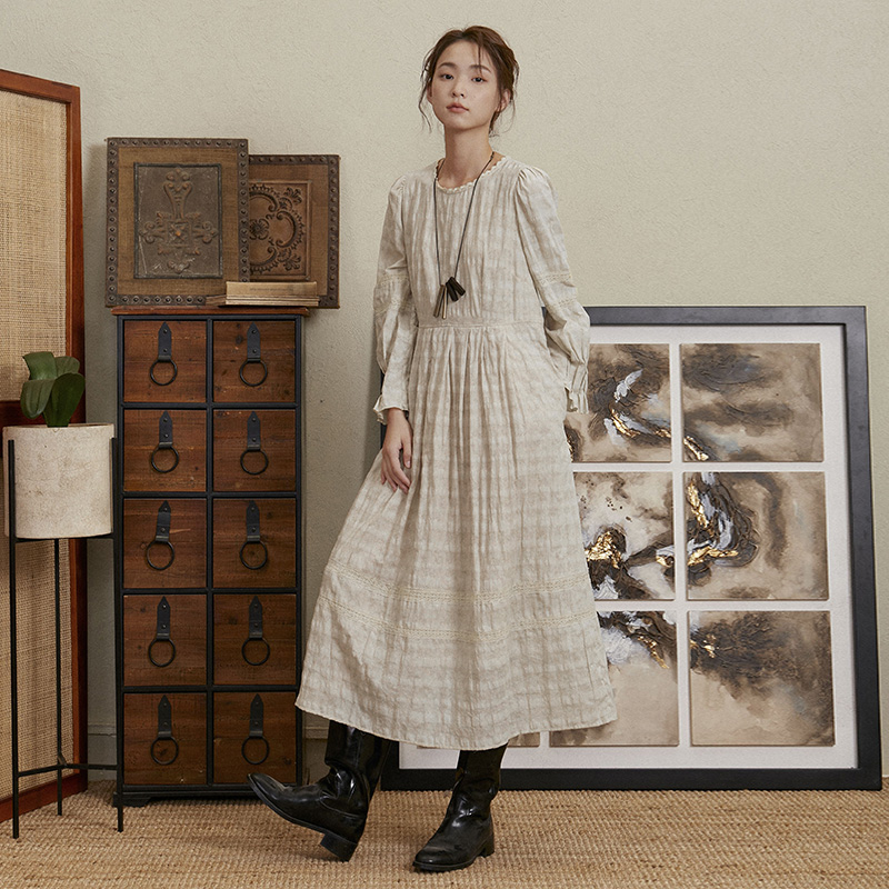 TALASA商场同款棉麻连衣裙2023年秋新款蕾丝法式复古盐缩设计长裙