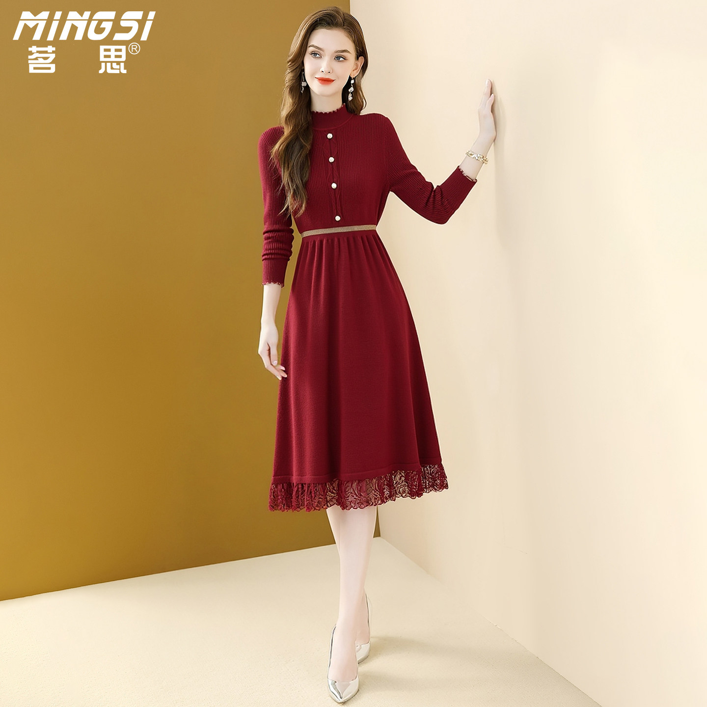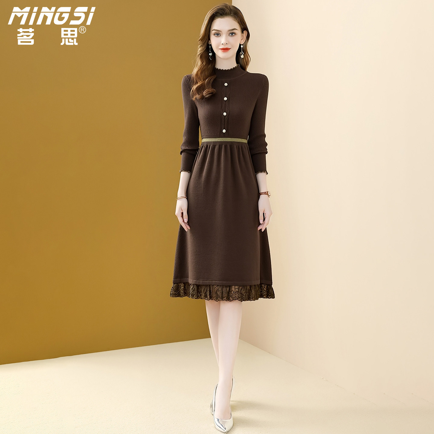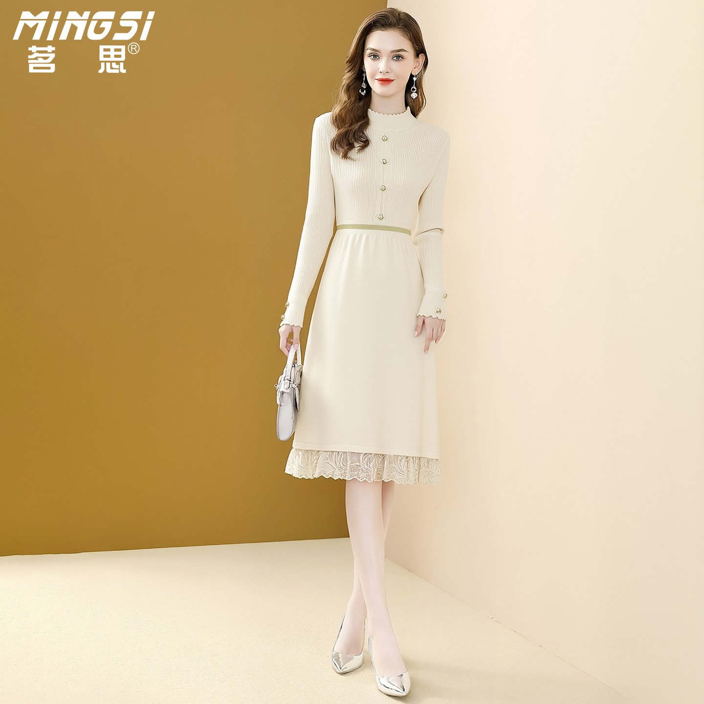 茗思半高领针织连衣裙女2025秋冬新款气质通勤长袖蕾丝显瘦毛衣裙