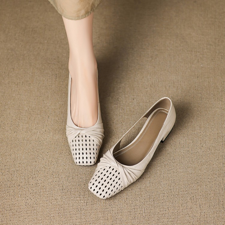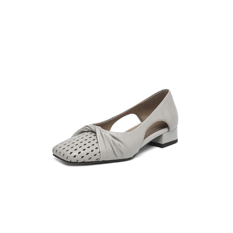 巨好穿法式单鞋女春夏季镂空小香风方头低跟粗跟中跟真皮灰色凉鞋
