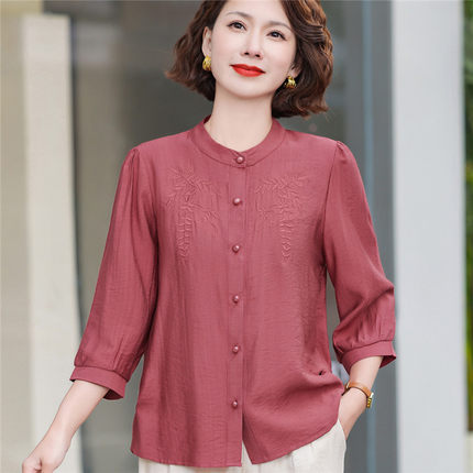 妈妈夏装洋气上衣棉麻七分袖衬衫
