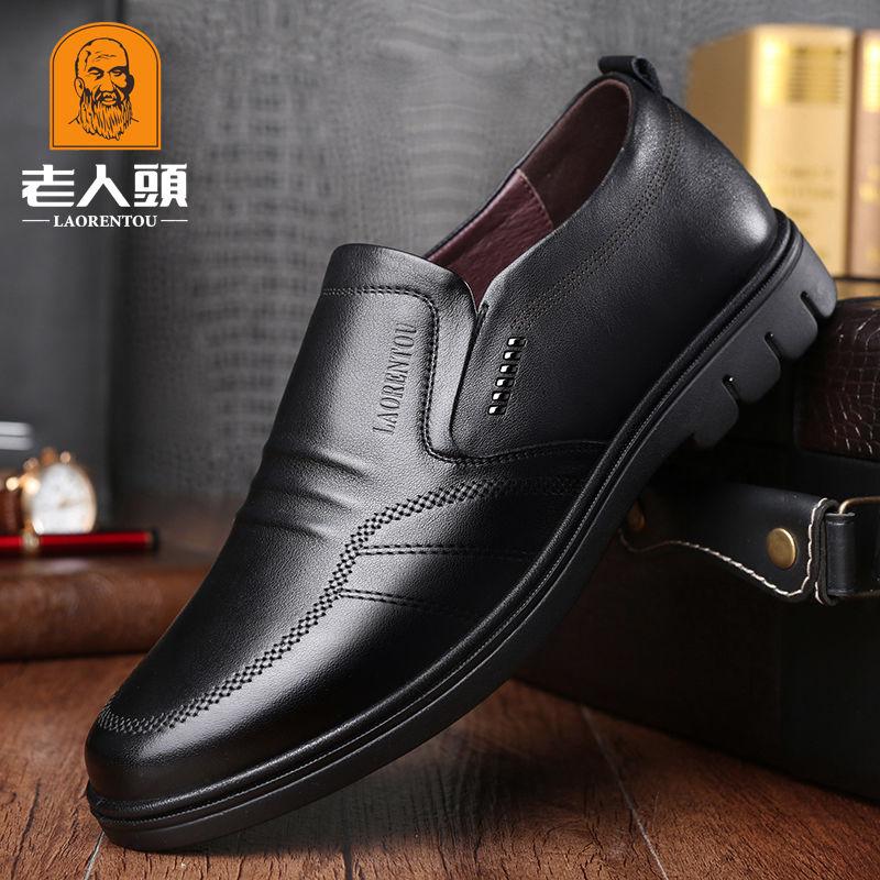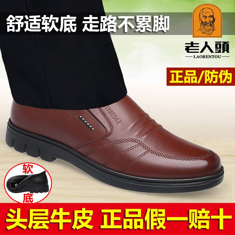 正品老人头男鞋春秋商务休闲皮鞋男真皮套脚软底中老年圆头爸爸鞋
