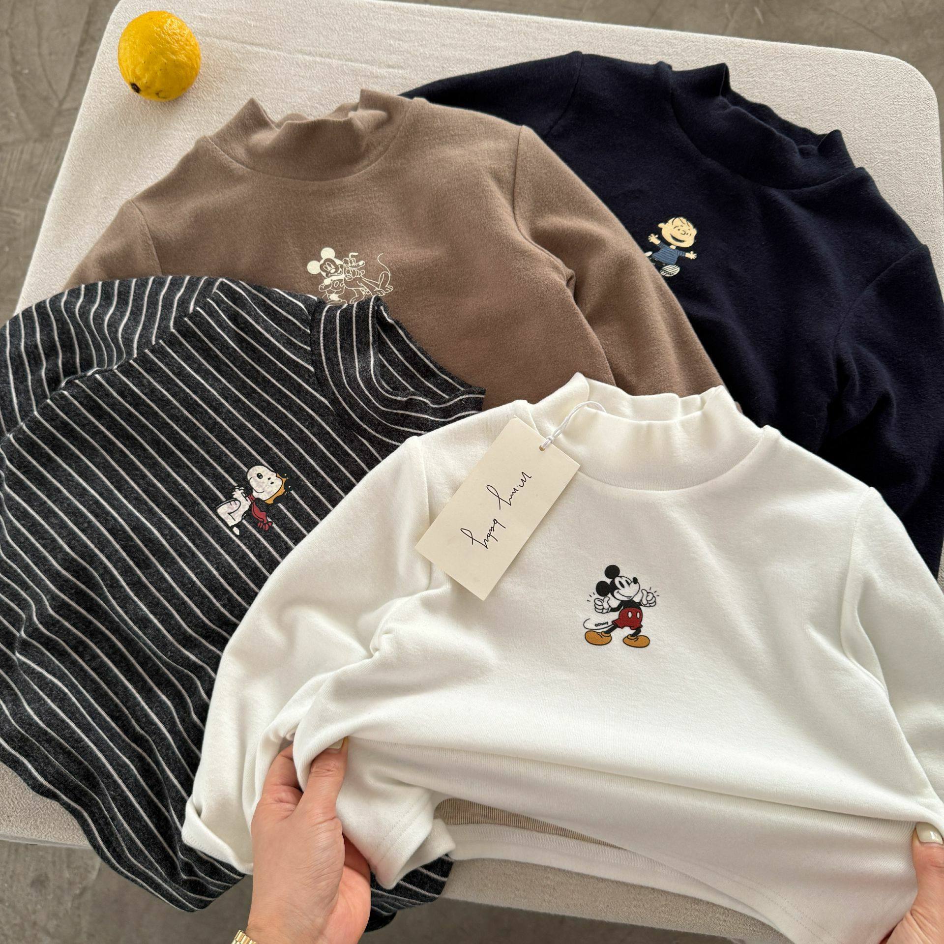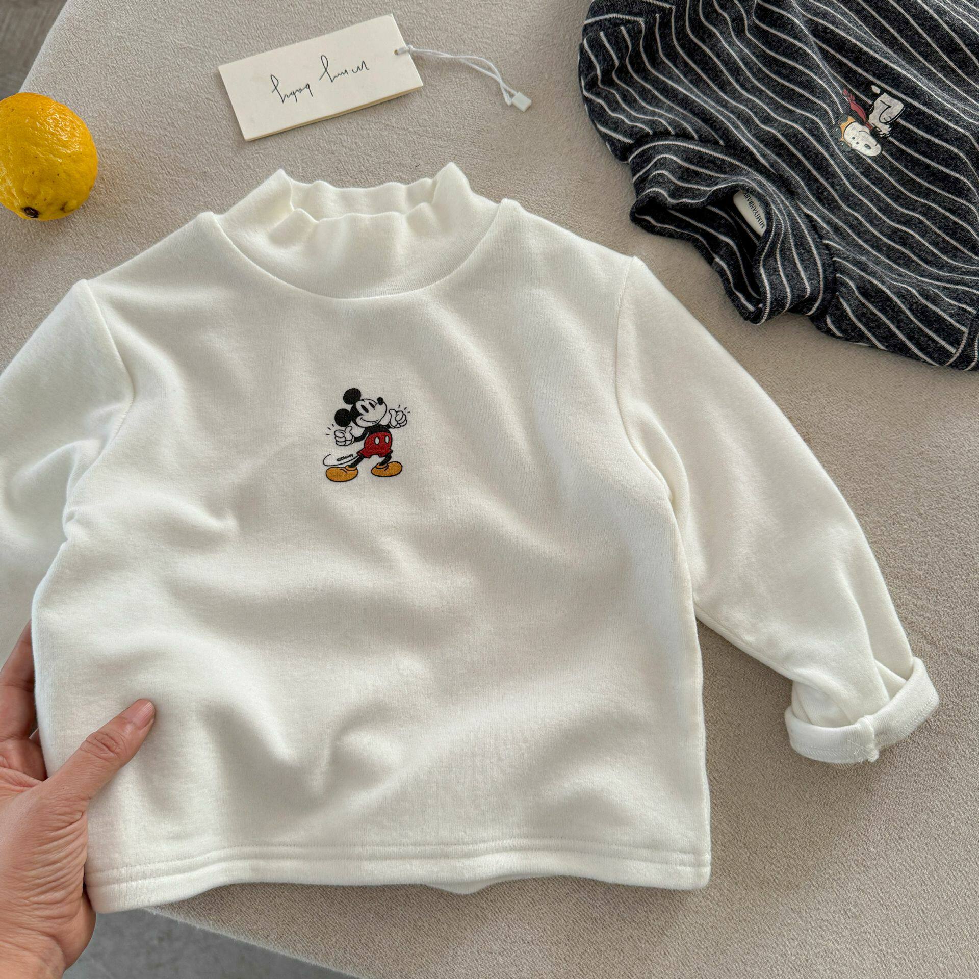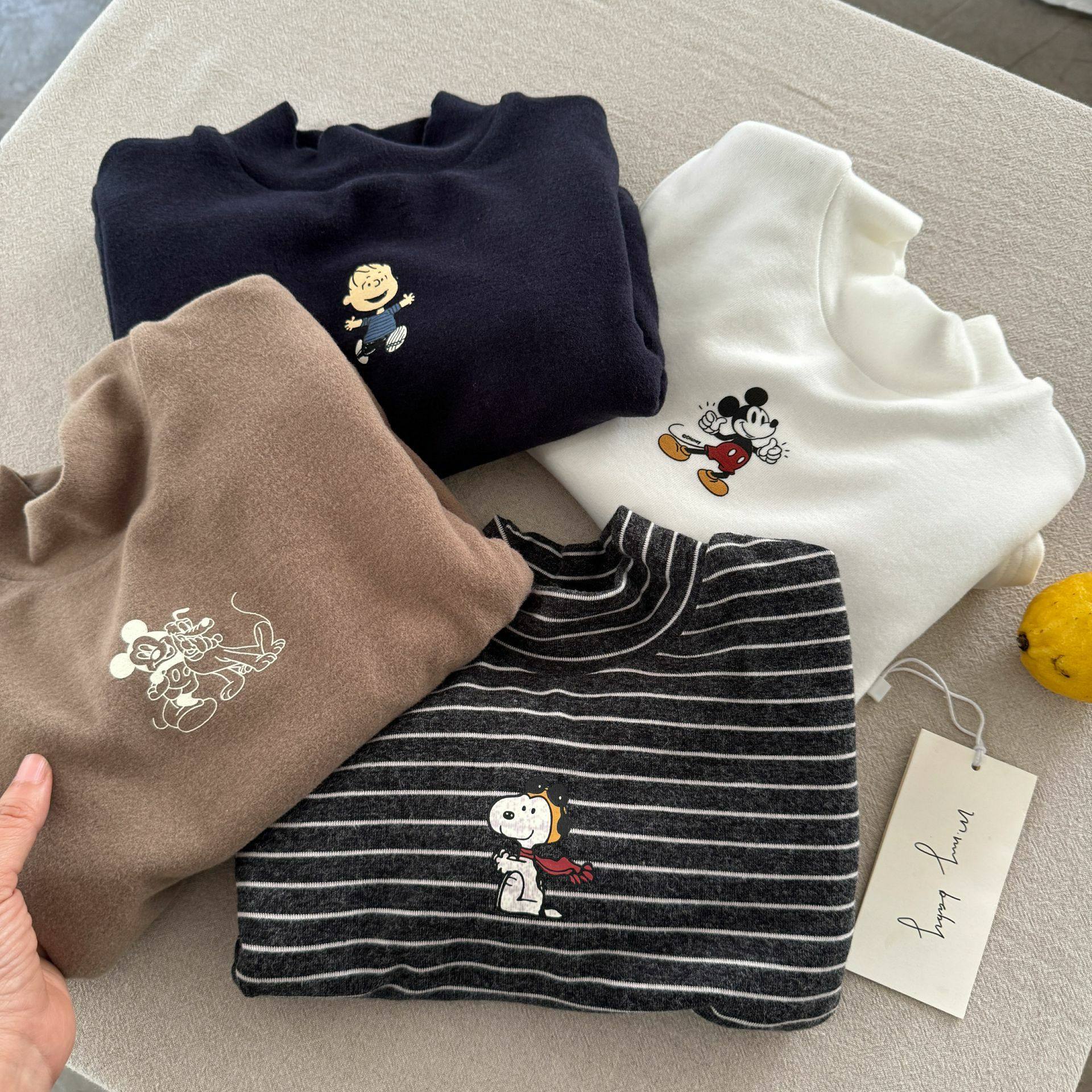 儿童加厚打底衫男2025冬季新款小童条纹上衣潮宝宝卡通T恤女羊绒