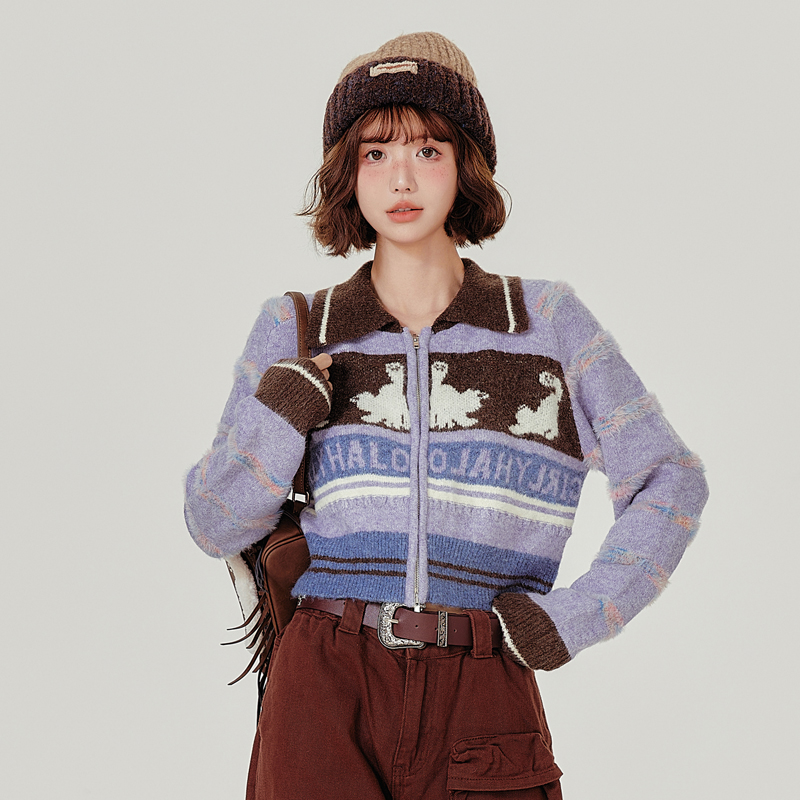 Girlyhalo美式复古双开拉链针织开衫女秋冬翻领短款休闲毛衣外套