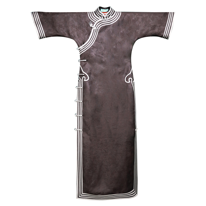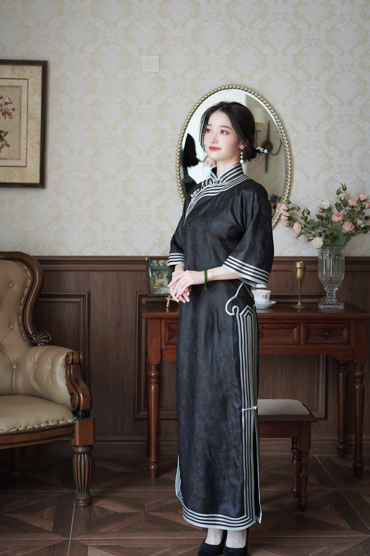 文墨轩* 三重门提花真丝香云纱古法一片式无省修身七分袖旗袍复古