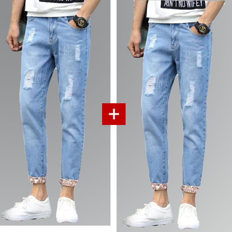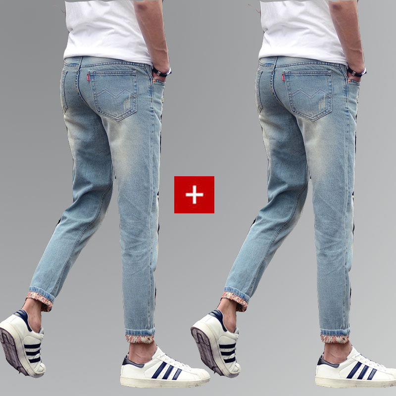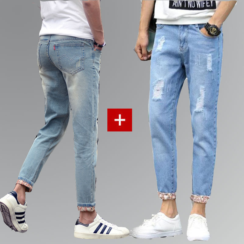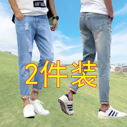 9分牛仔裤青少年男裤破洞痞帅宽松九分裤子哈伦裤男网红学生外穿