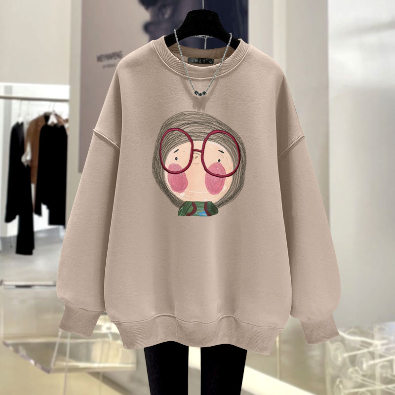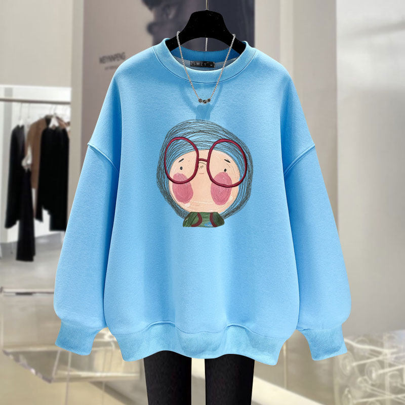 2025春秋冬季萌趣大眼镜卡通中长款加绒加厚宽松套头圆领卫衣女潮