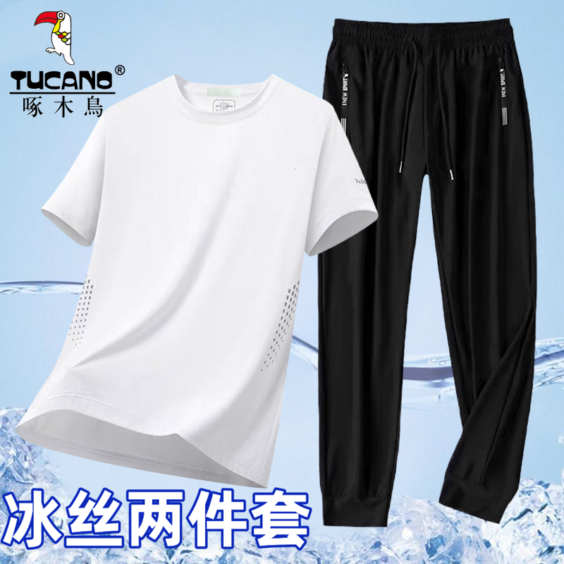 啄木鸟薄款冰丝速干套装男士夏季圆领透气短袖T恤休闲运动两件套