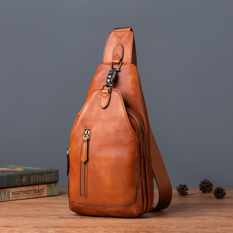 植鞣牛皮新款男士胸包复古真皮软皮斜挎包休闲单肩包擦色运动背包