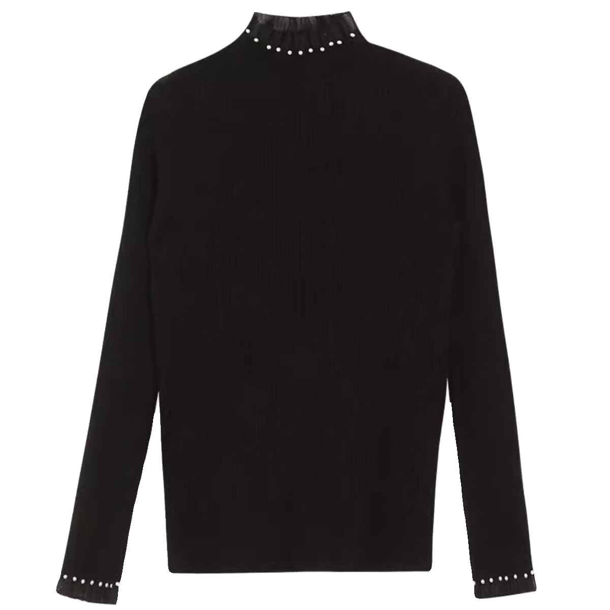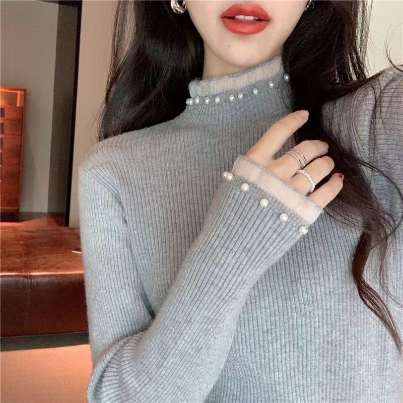 2025秋冬季新款珍珠毛衣针织拼接上衣小香风半高领内搭打底衫女潮