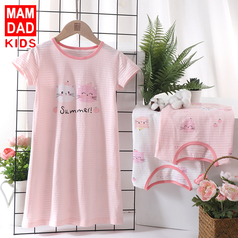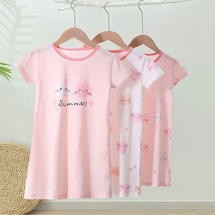 女童A类竹节棉甜美睡裙2025夏季薄款透气宝宝短袖亲子款小猫睡衣