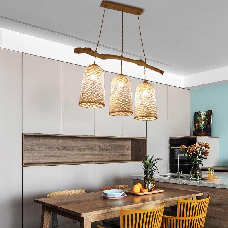 吊灯 新中式禅意茶室灯创意个性三头餐厅树枝灯竹编吊灯