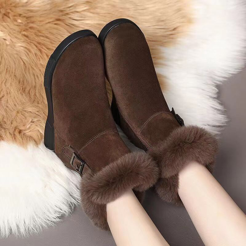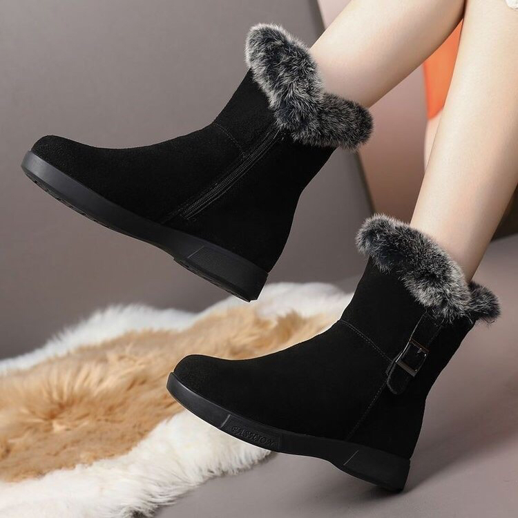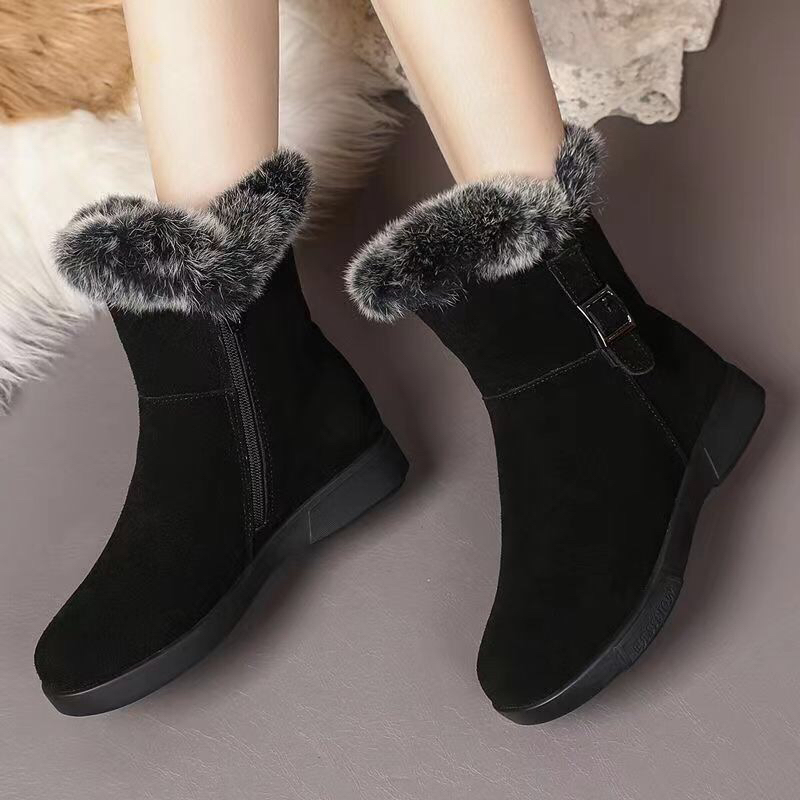 兔毛加厚真皮雪地靴女2025新款冬季防滑中筒靴加绒保暖平底棉靴子