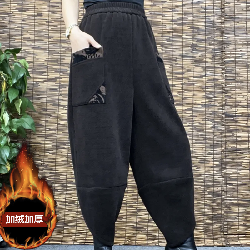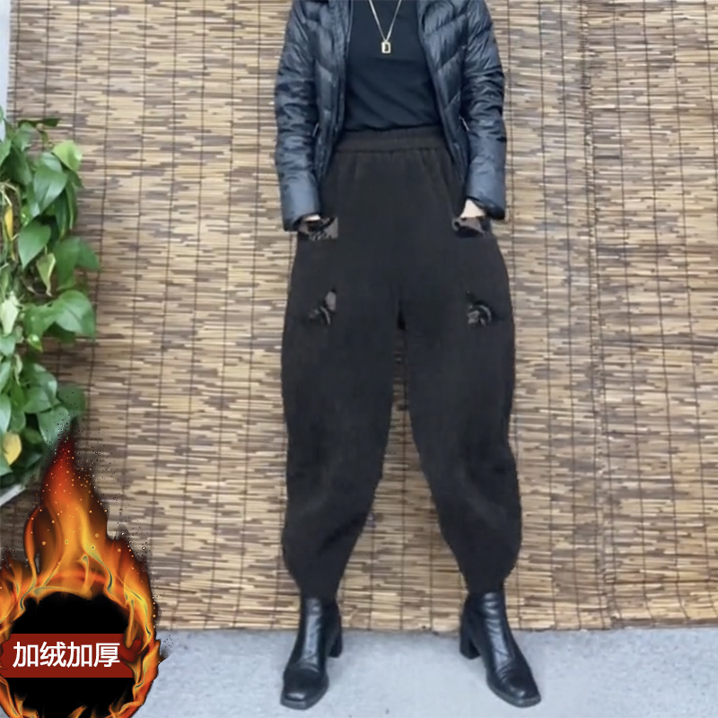 洋气妈妈装2024冬时尚百搭松紧腰大码拼接鱼嘴休闲加绒加厚哈伦裤