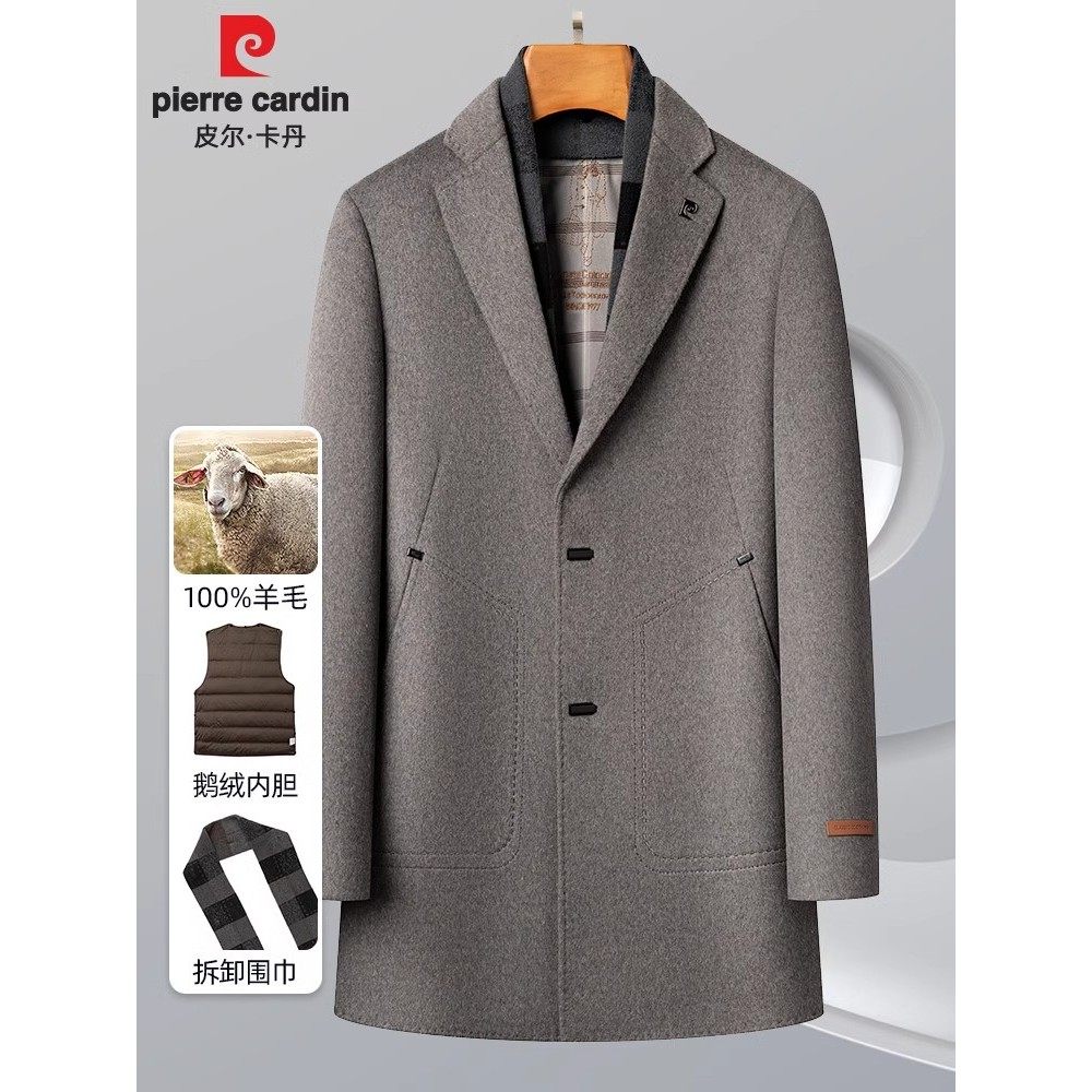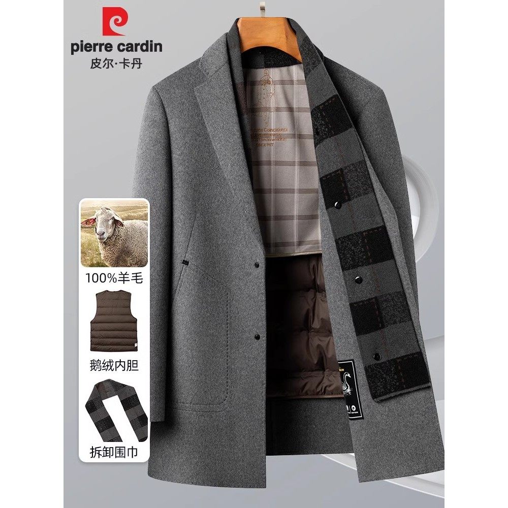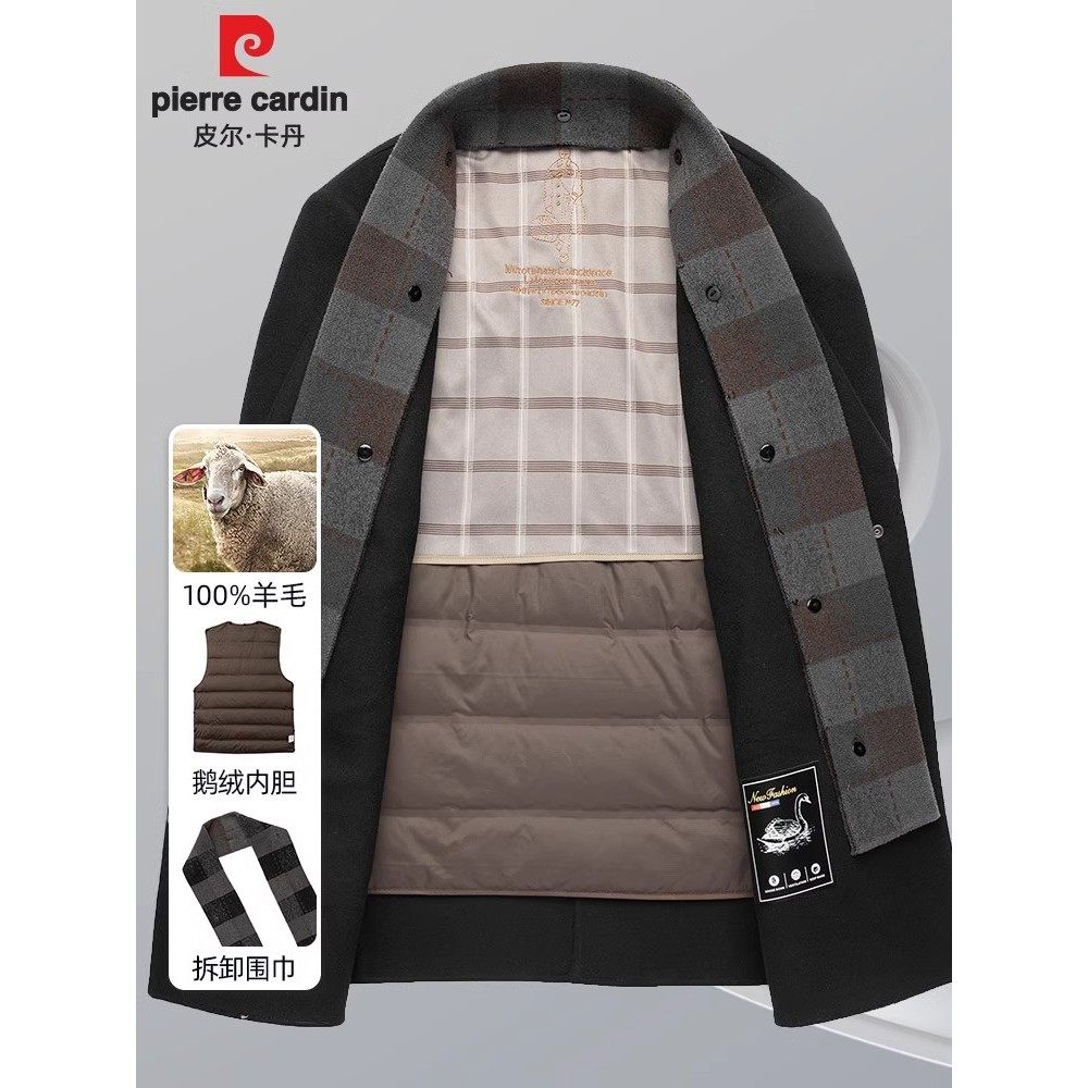 皮尔卡丹羊绒大衣男中长款秋冬季爸爸装中年羊毛呢围巾领加厚外套