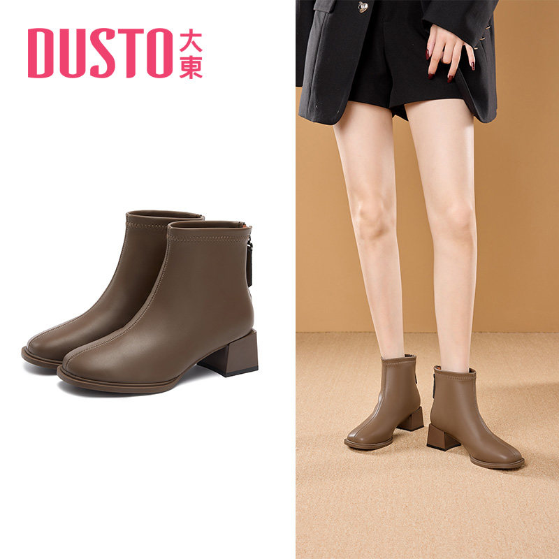 大东短靴女冬季新款简约舒适粗跟中跟方头女靴子后拉链女鞋0125