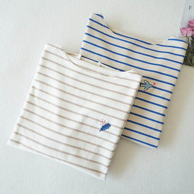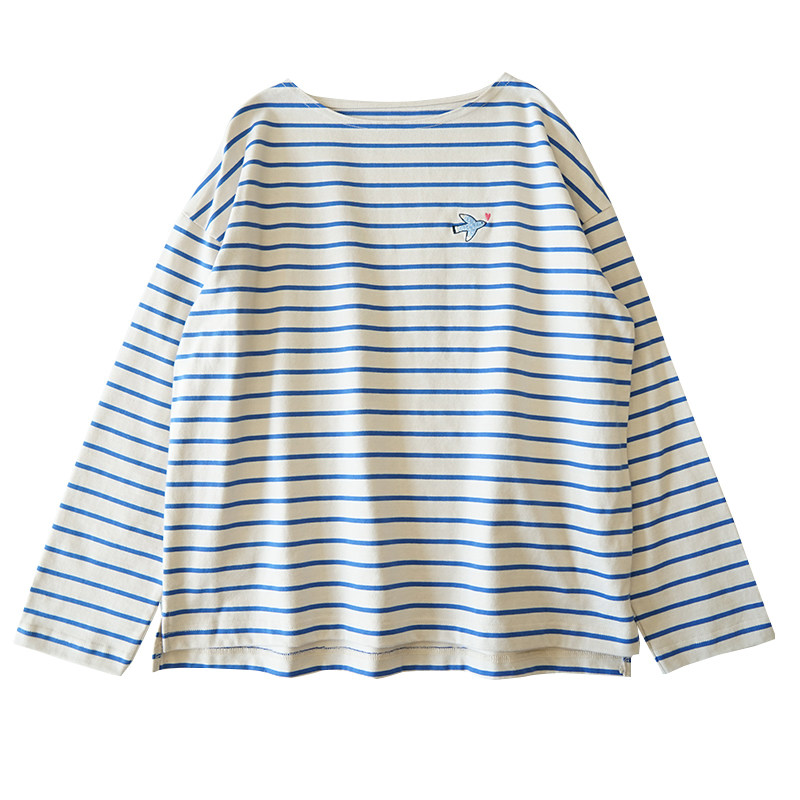 新款宽松纯棉长袖条纹衫女士T恤休闲上衣百搭日系通勤春秋款T399