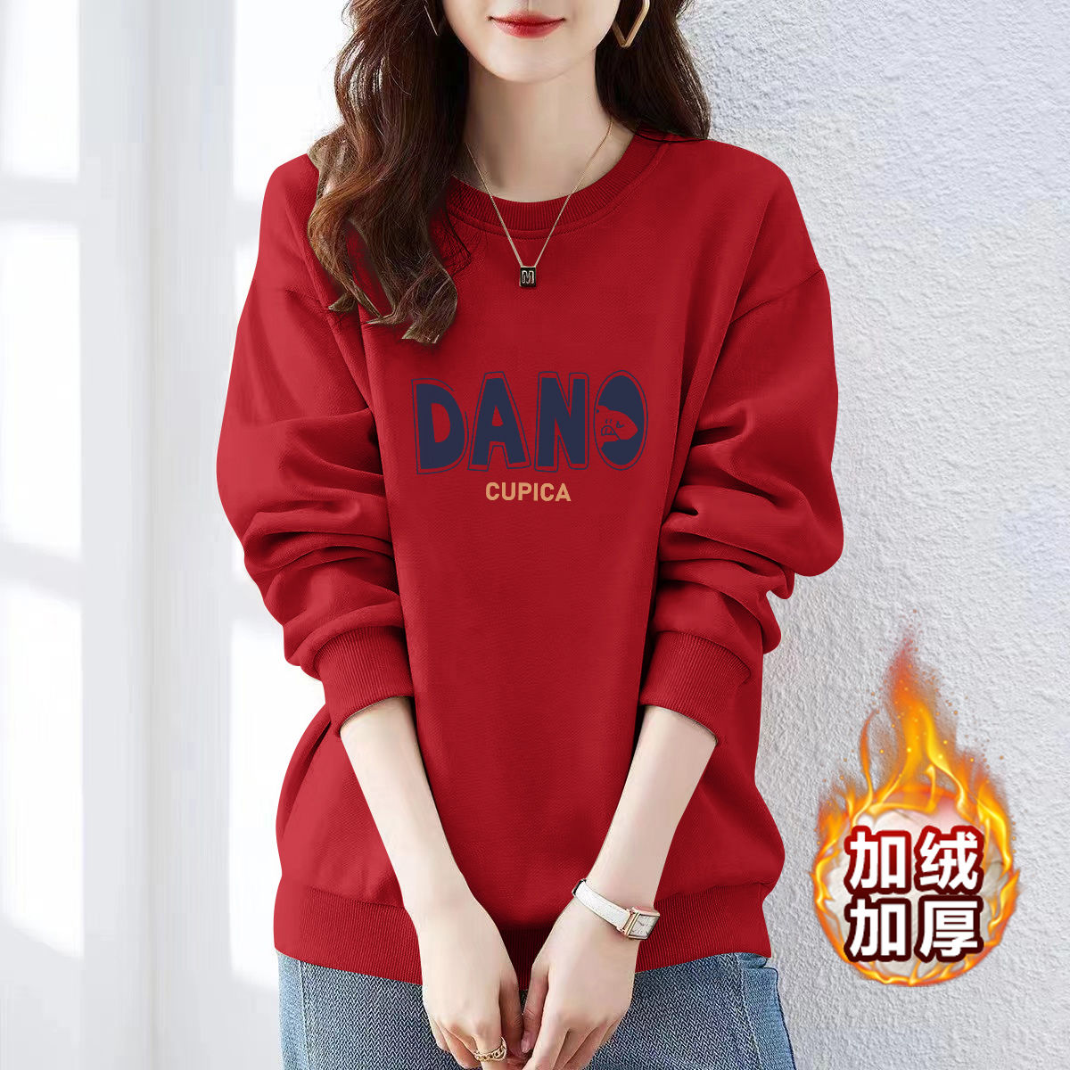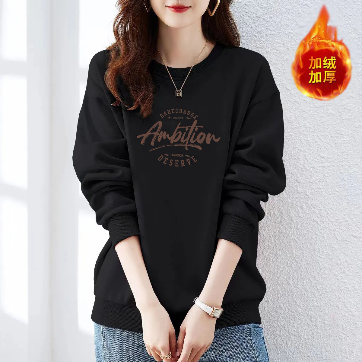 即墨加绒加厚卫衣女纯棉高档秋冬宽松显瘦圆领百搭外穿潮流上衣