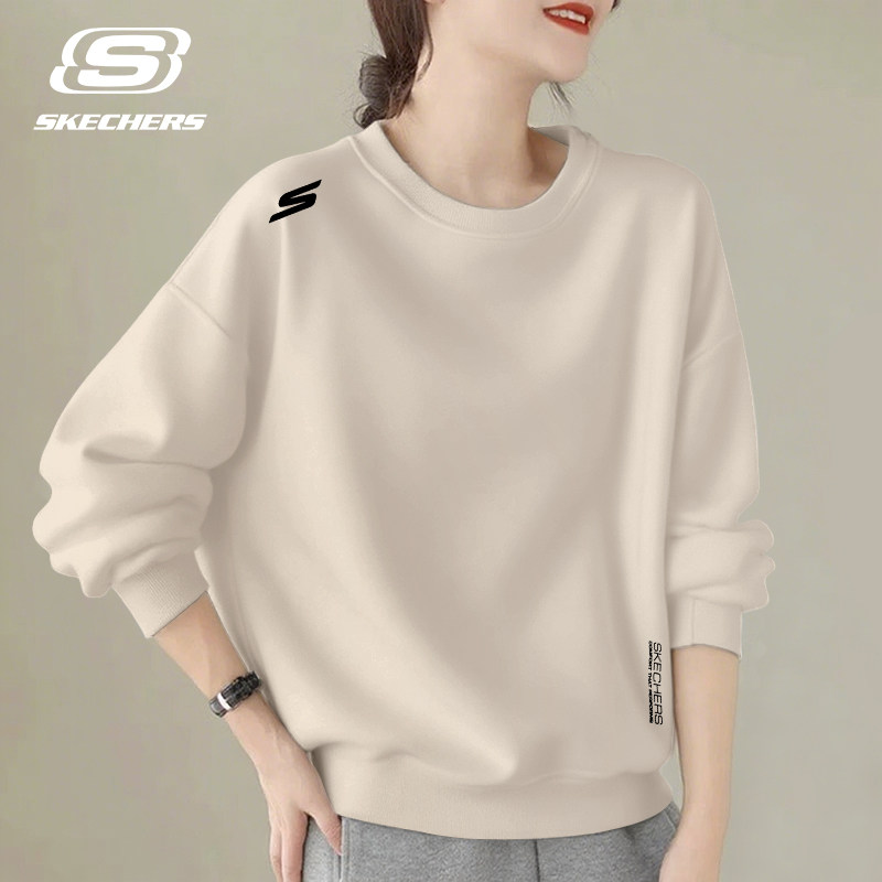斯凯奇套头衫女款韩版加绒运动卫衣白色圆领秋冬季通勤舒适长袖女