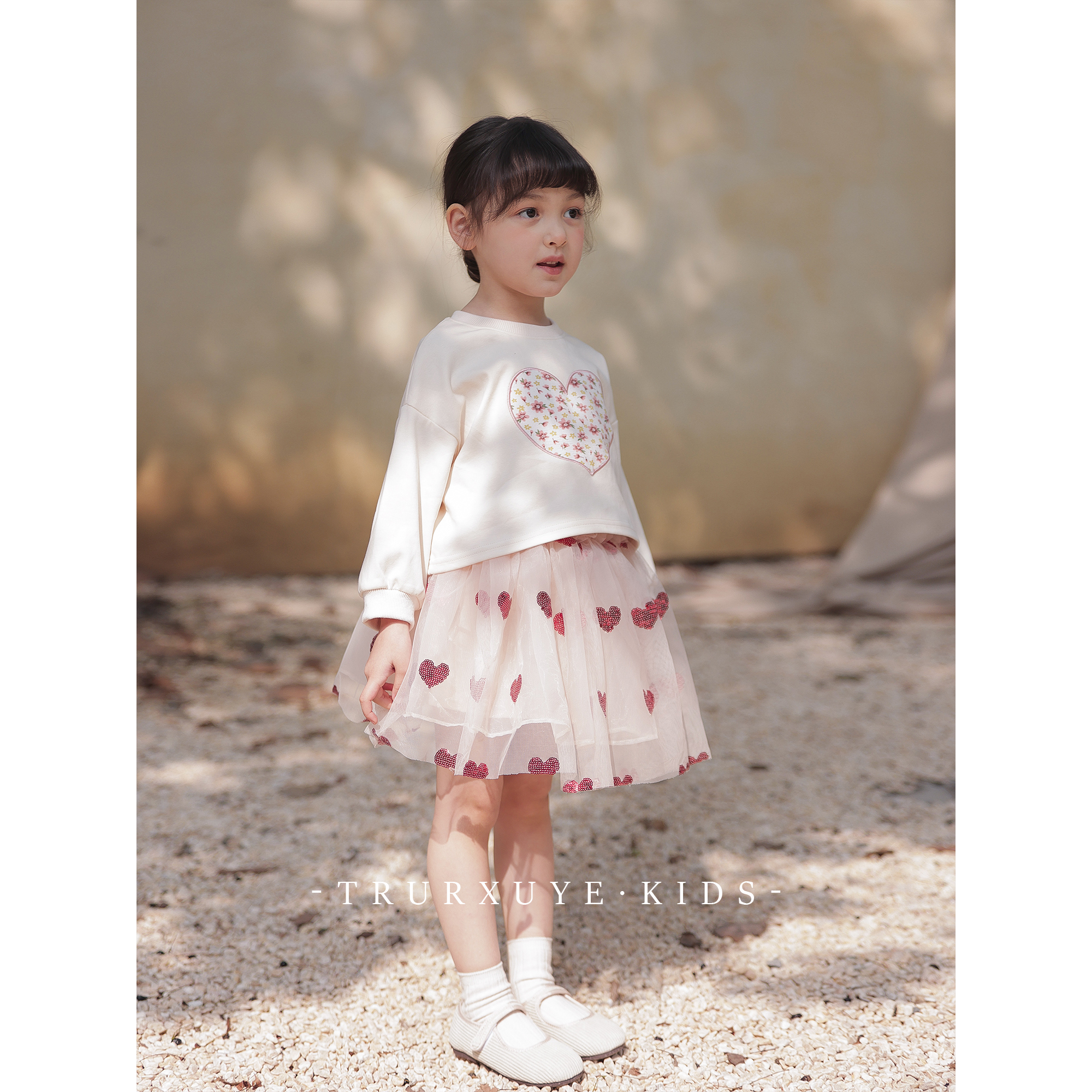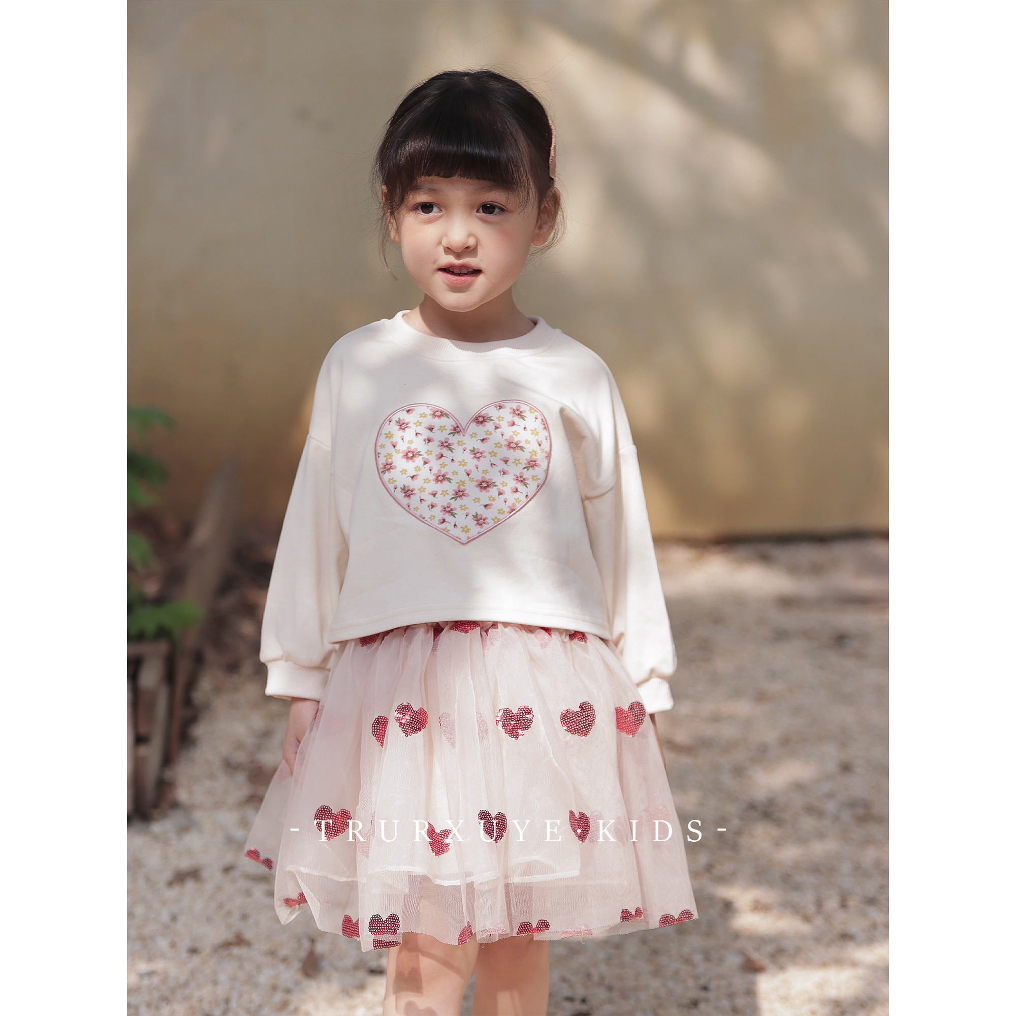 【初煦 高端女童】短款卫衣套头衫 女宝宝爱心亮片纱纱半身裙套装