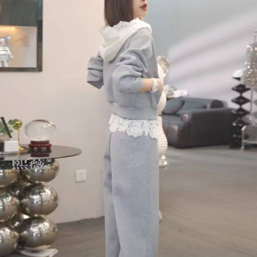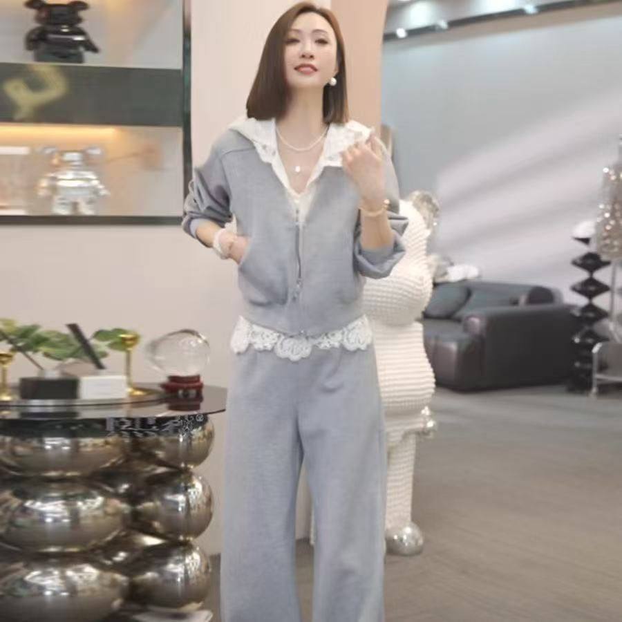 蕾丝2025春季新款套装女拼接显瘦连帽时尚洋气裤子上衣两件套女