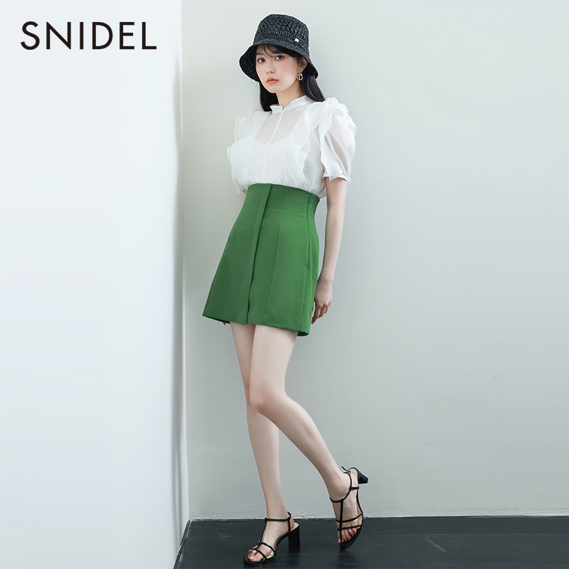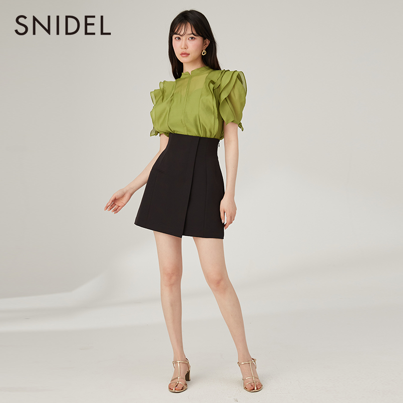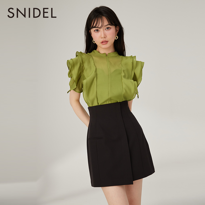 SNIDEL春夏款立领雪纺泡泡袖蕾丝微透荷叶边衬衫上衣SWFB232074