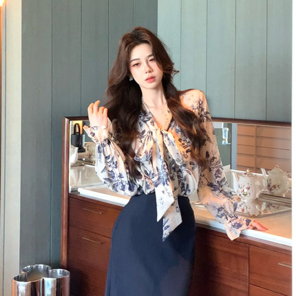 木子李的李2025秋冬长袖印花雪纺衫上衣西装风衣外套半身裙套装女