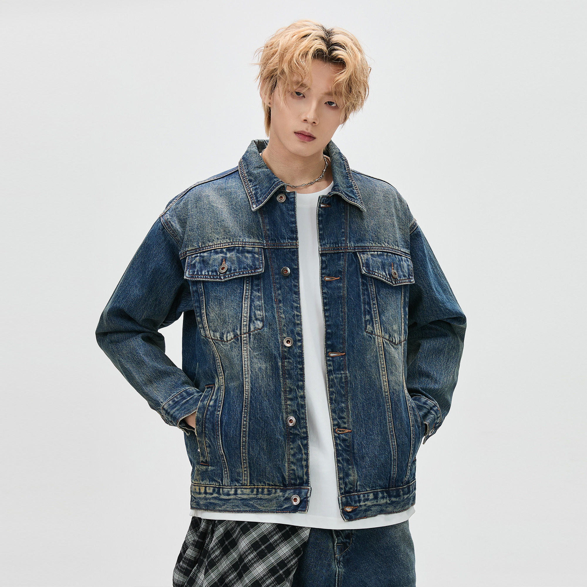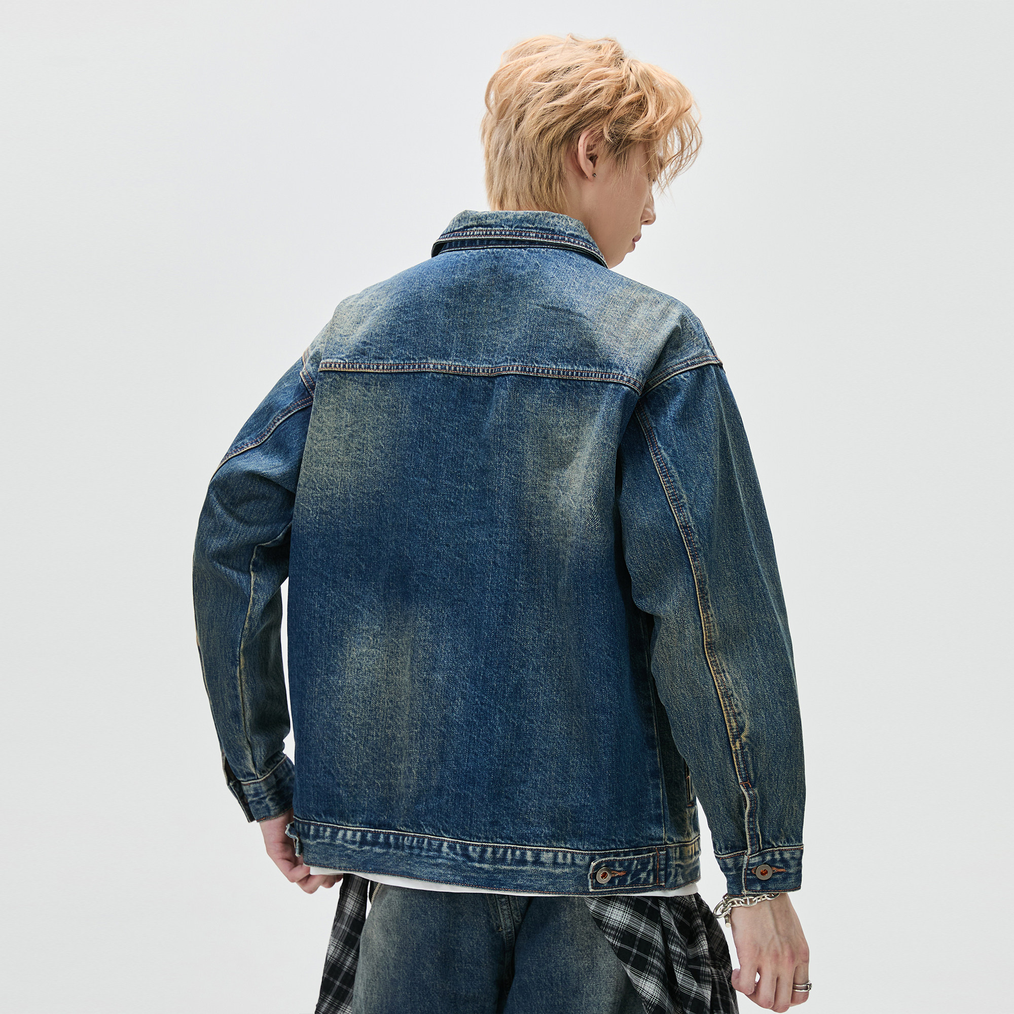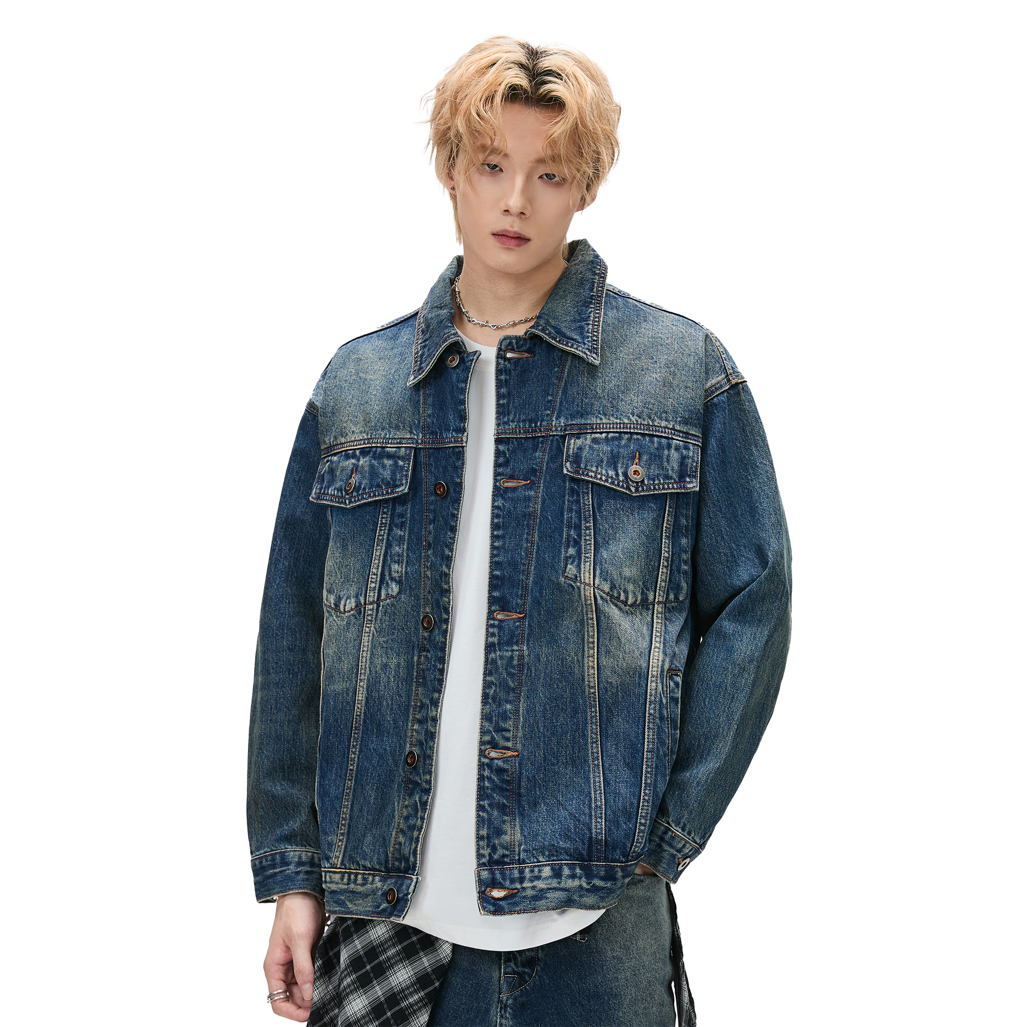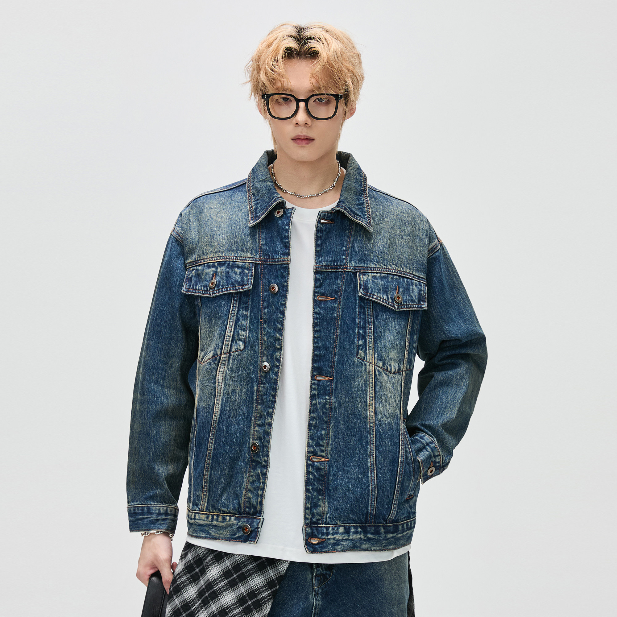 ALLIN 复古做旧对称翻盖口袋牛仔夹克男春秋美式百搭情侣牛仔外套