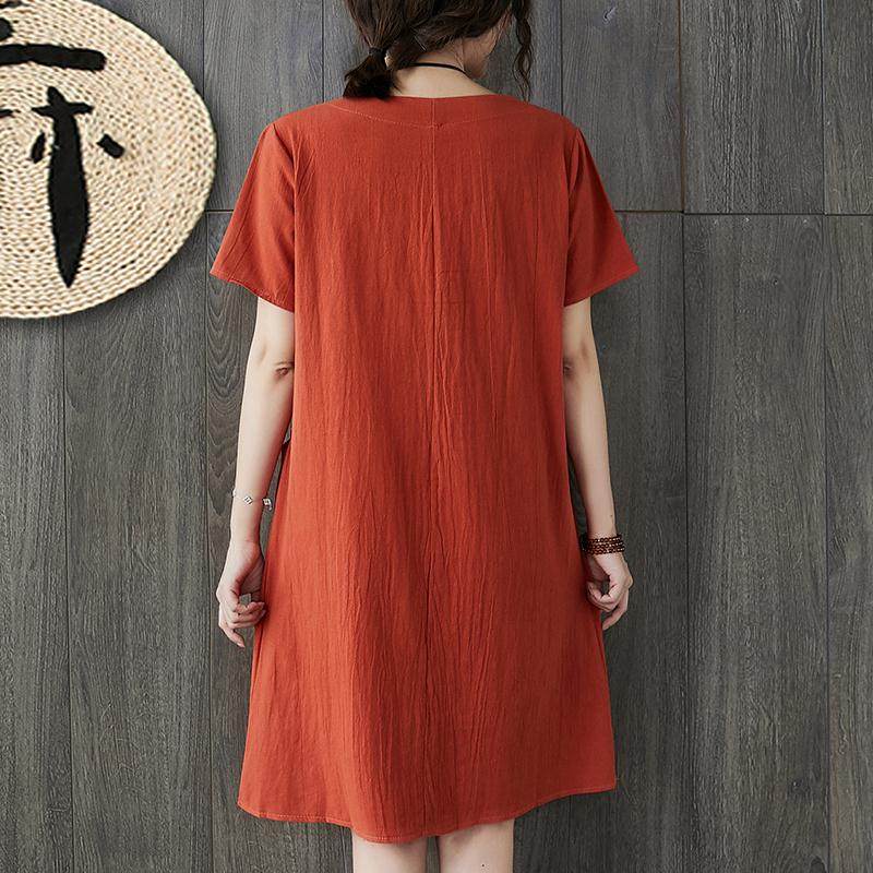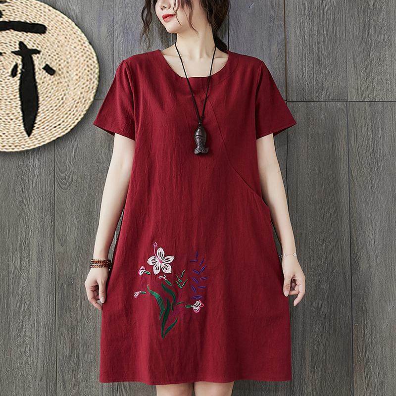 花朵刺绣棉麻连衣裙夏胖mm大码女装中长款遮肚子短袖亚麻A字裙子