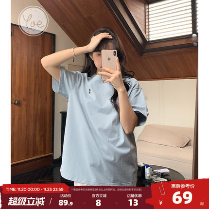 yoe短袖t恤女上衣夏季新款圆领纯棉体恤蓝色休闲女装刺绣小狗简约