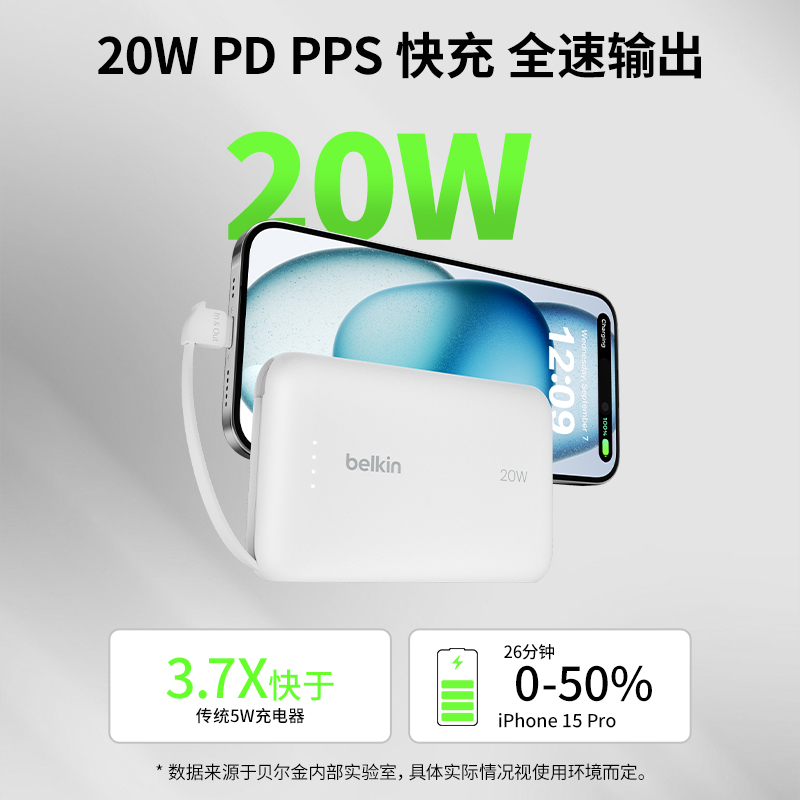 【3C认证】Belkin贝尔金2025新款充电宝10000毫安快充大容量自带线移动电源适用苹果iPhone17promax可上飞机
