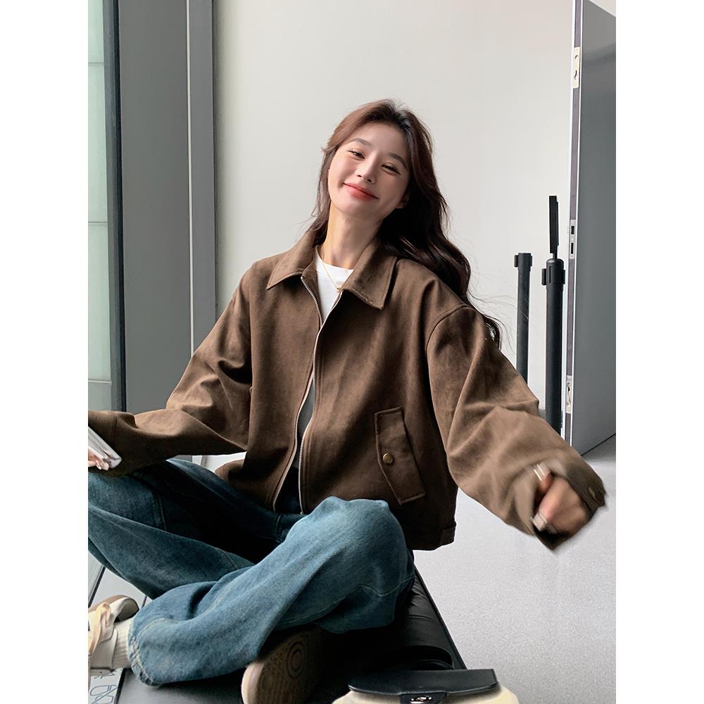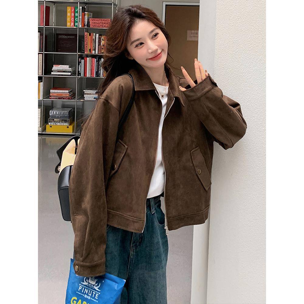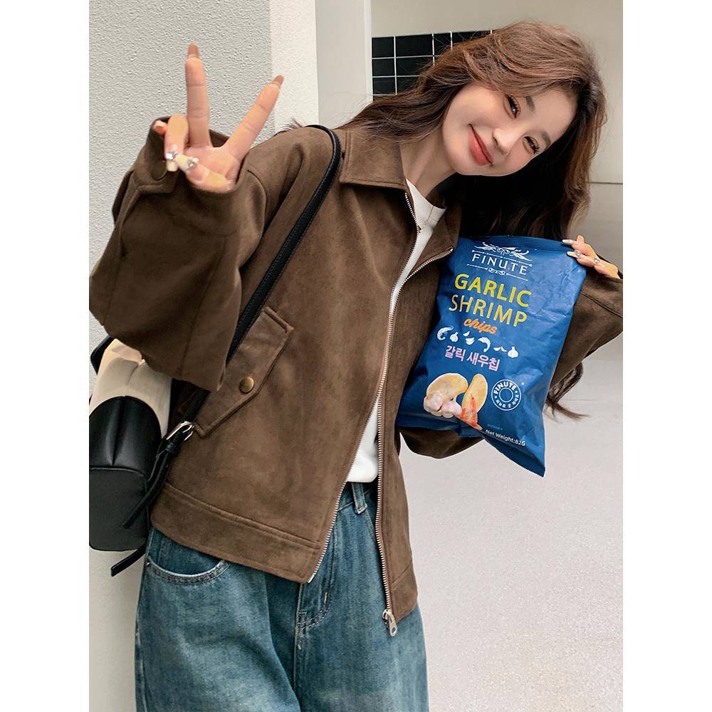 美拉德棕色外套潮春秋复古仿麂皮绒百搭设计感短款小个子上衣夹克