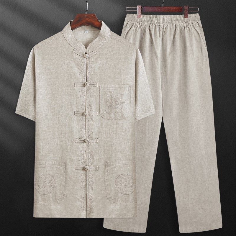 唐装男中老年夏季棉麻短袖爸爸装亚麻套装中国风爷爷夏装老人衣服