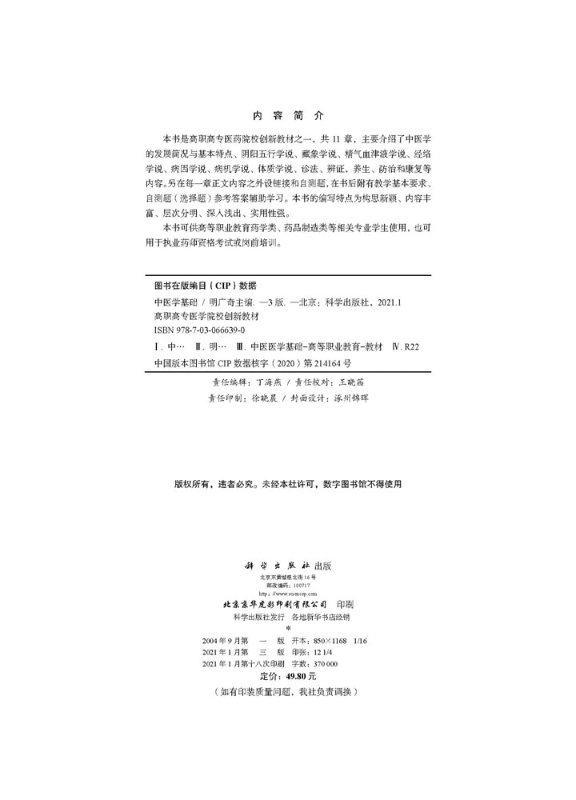 中医学基础(第三版)(药学四版)明广奇 编 高职高专医药院校创新教材 高职高专医药院校创新教材 科学出版社