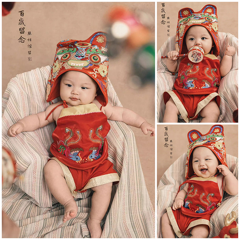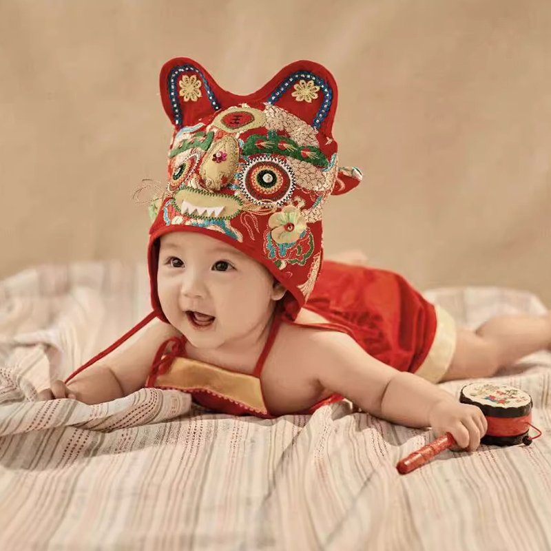 儿童摄影服装蛇年复古风虎头帽百天主题宝宝百日照周岁照拍照道具