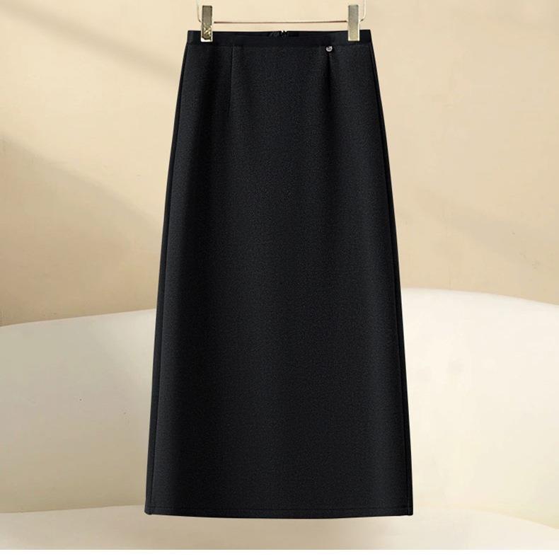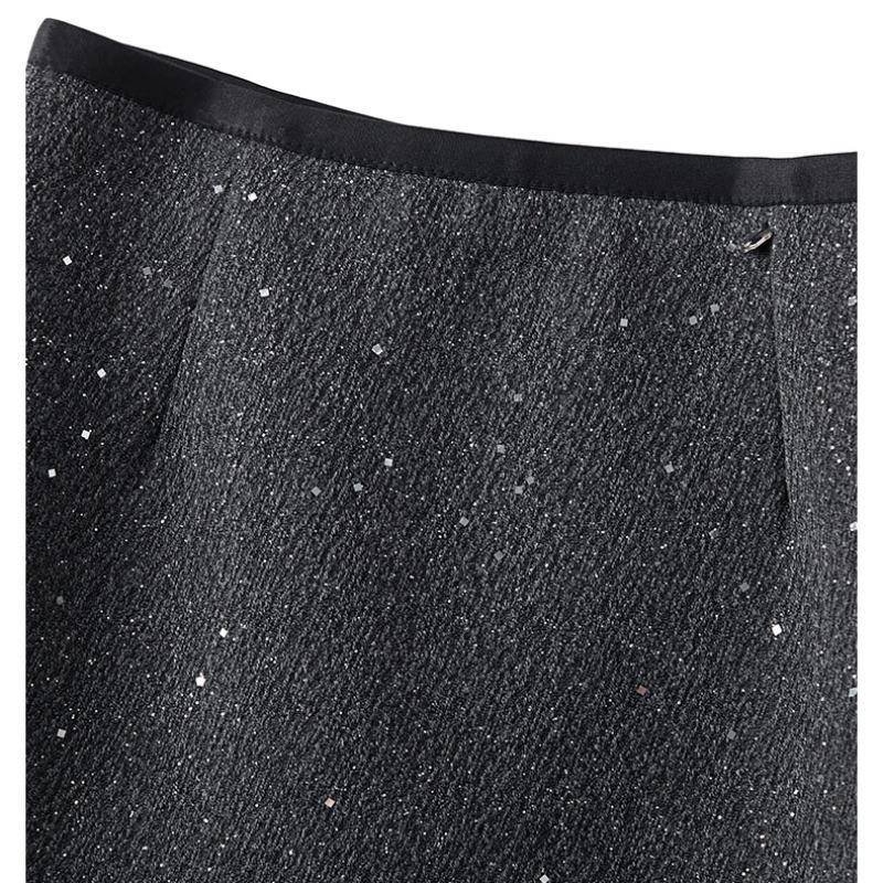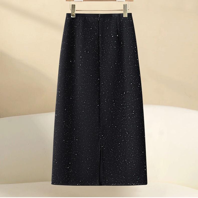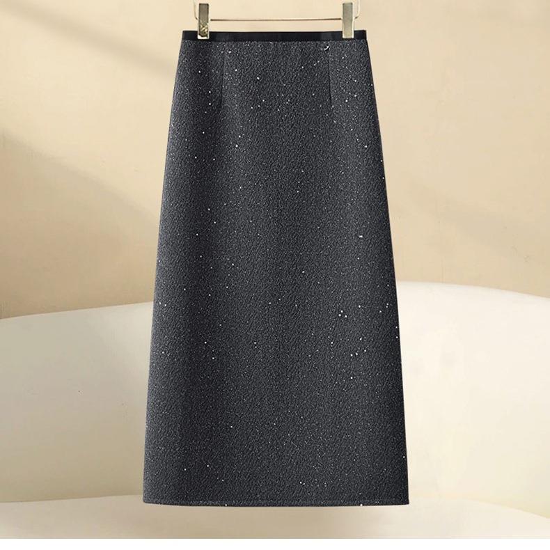 黑色亮片半身裙女秋冬季2024新款a字裙中长款冬裙毛呢直筒包臀裙