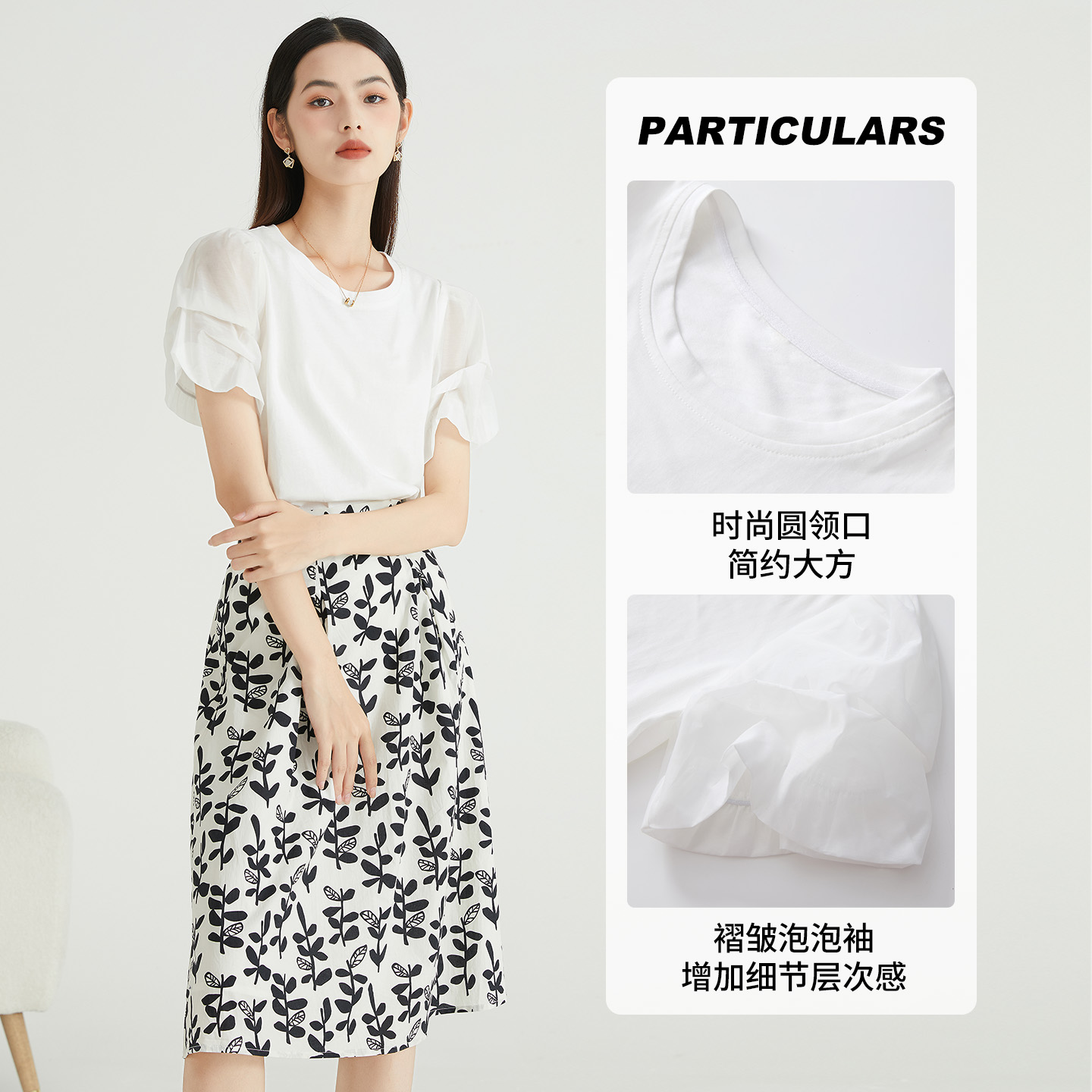 马天奴春夏米白圆领泡泡袖上衣T恤印花半身裙半裙子两件套装时尚