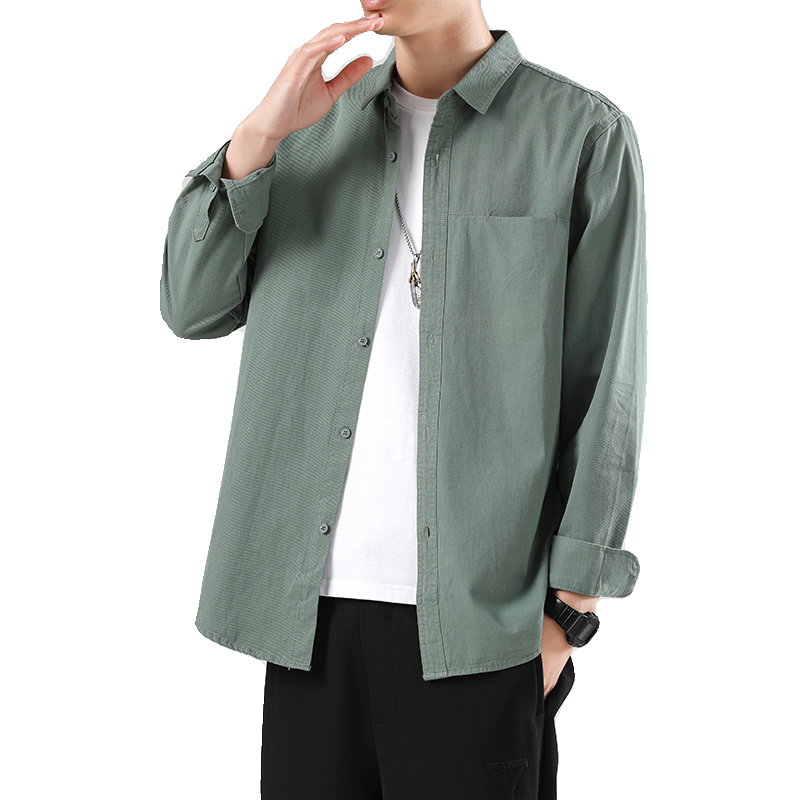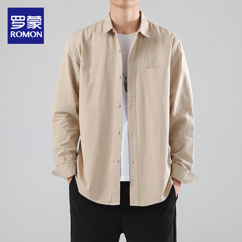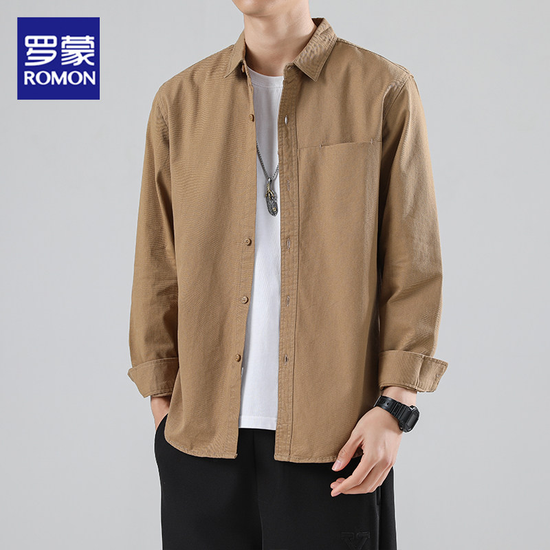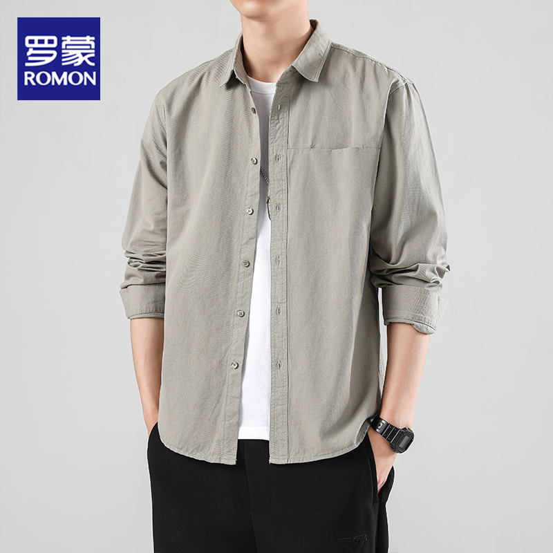 罗蒙重磅纯棉休闲长袖翻领衬衫男