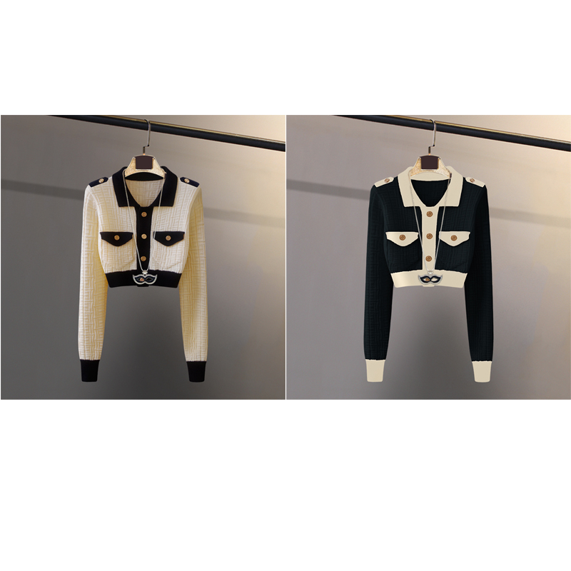复古法国拼色小香风针织开衫女秋冬外搭短款高腰外套厚款长袖上衣