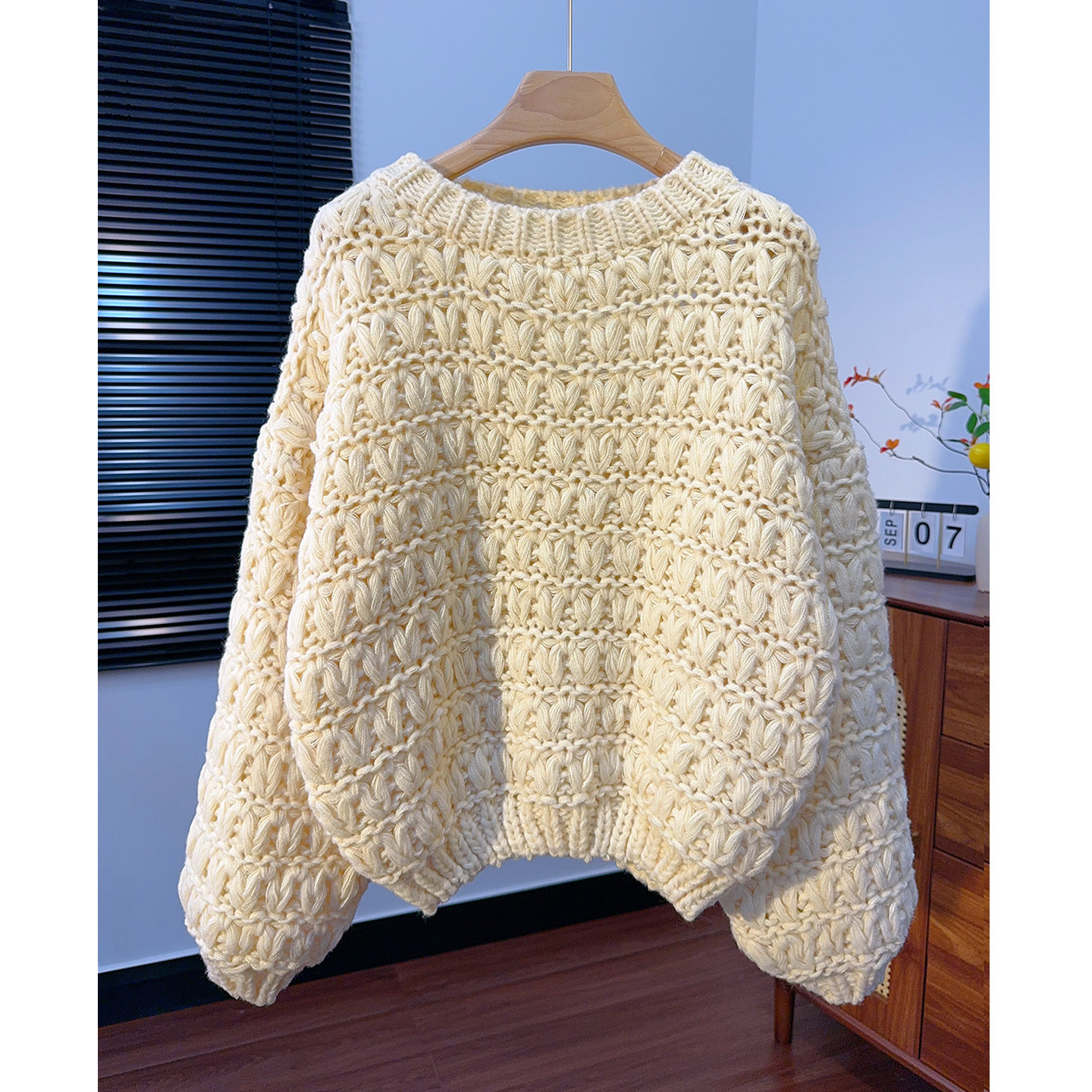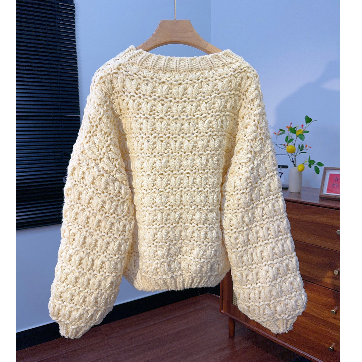 粗针手工编织毛衣女套头宽松慵懒风短款圆领灯笼袖秋冬加厚针织衫